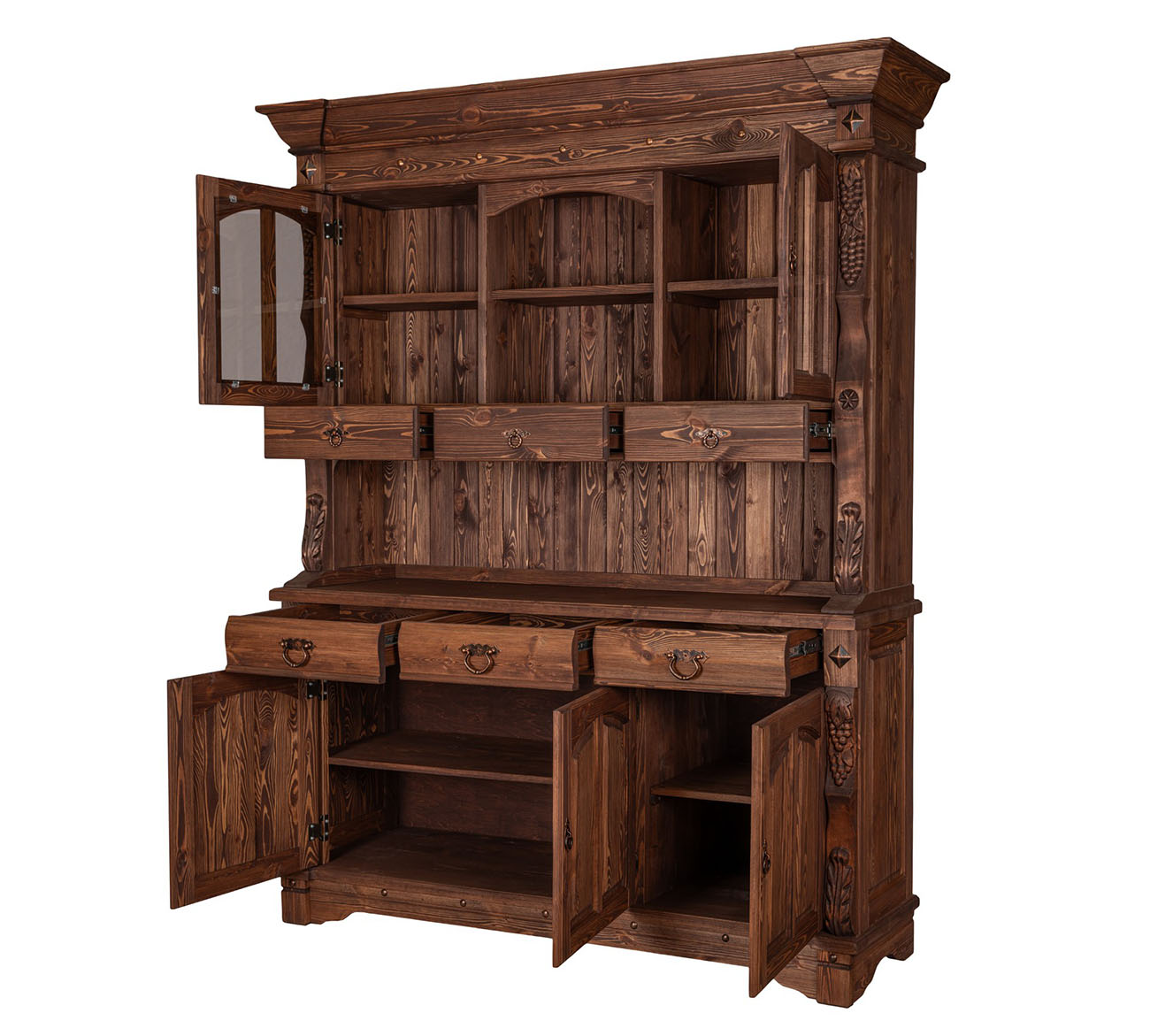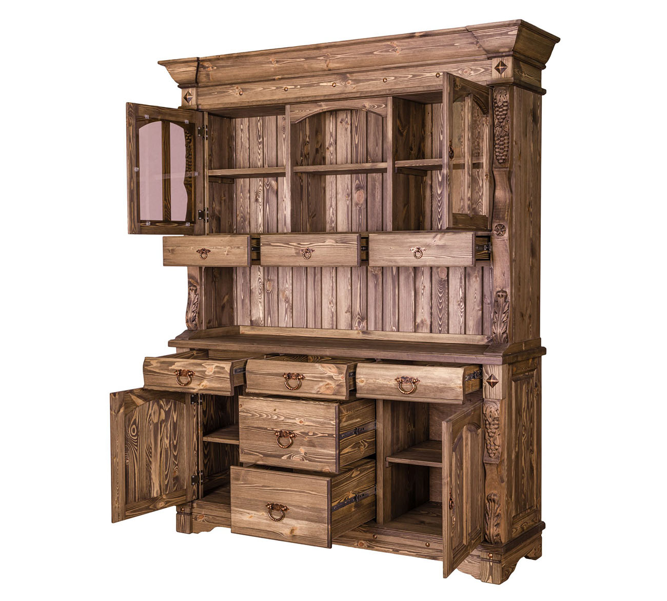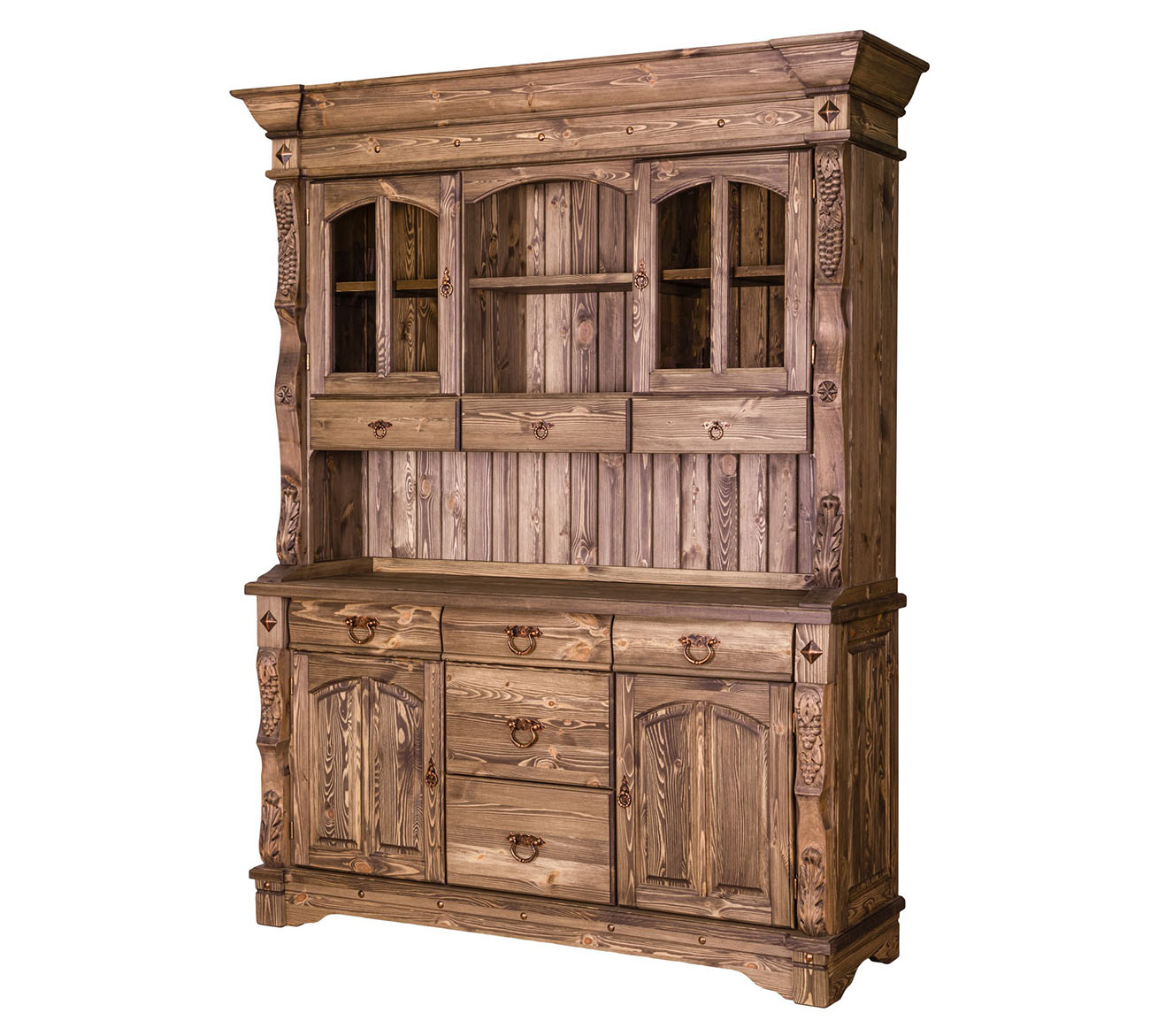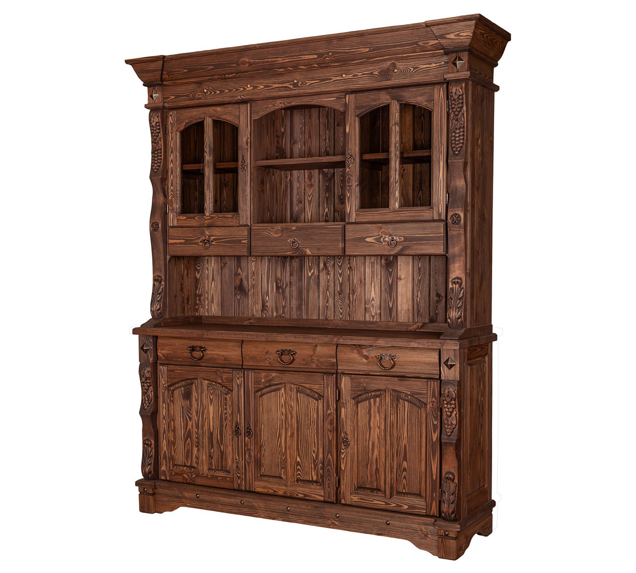 Буфет-витрина Викинг GL-05/1 в стиле кантри для гостиной или столовой. Конструкция условно разделена на 2 части: витрину с открытыми, застекленными полками, 3 выдвижными ящиками и тумбу с 3 ящиками для столовых принадлежностей и полками для хранения посуды. На ящиках установлены шариковые направляющие. Контрастная кованая фурнитура на фасадах отличается надежностью и удобством использования.
