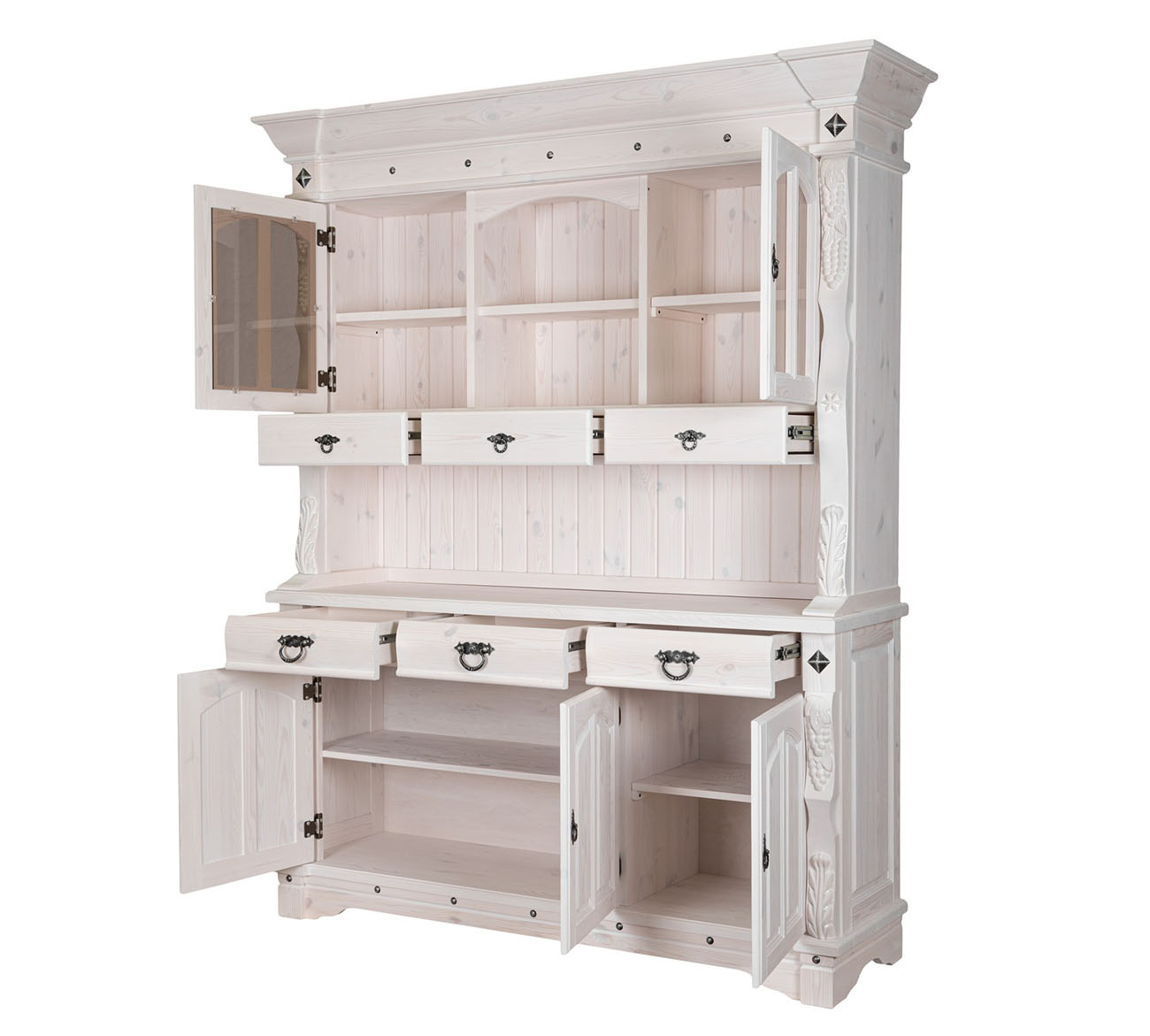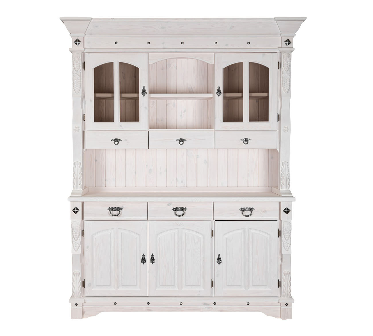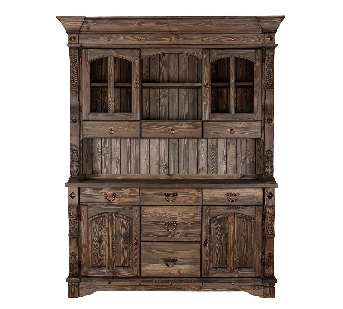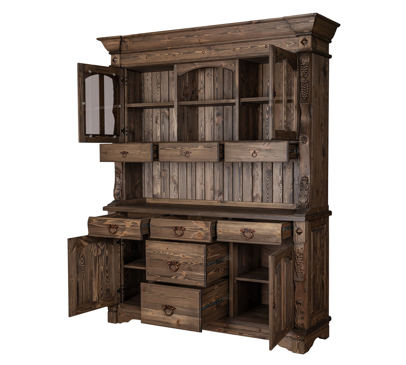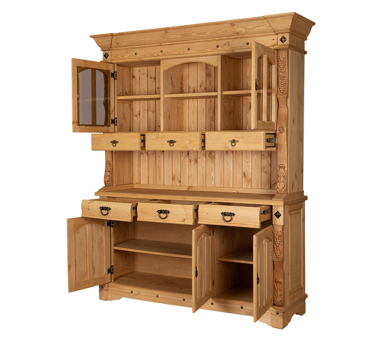 Буфет-витрина Викинг GL-05/1 в стиле кантри для гостиной или столовой. Конструкция условно разделена на 2 части: витрину с открытыми, застекленными полками, 3 выдвижными ящиками и тумбу с 3 ящиками для столовых принадлежностей и полками для хранения посуды. На ящиках установлены шариковые направляющие. Контрастная кованая фурнитура на фасадах отличается надежностью и удобством использования.
