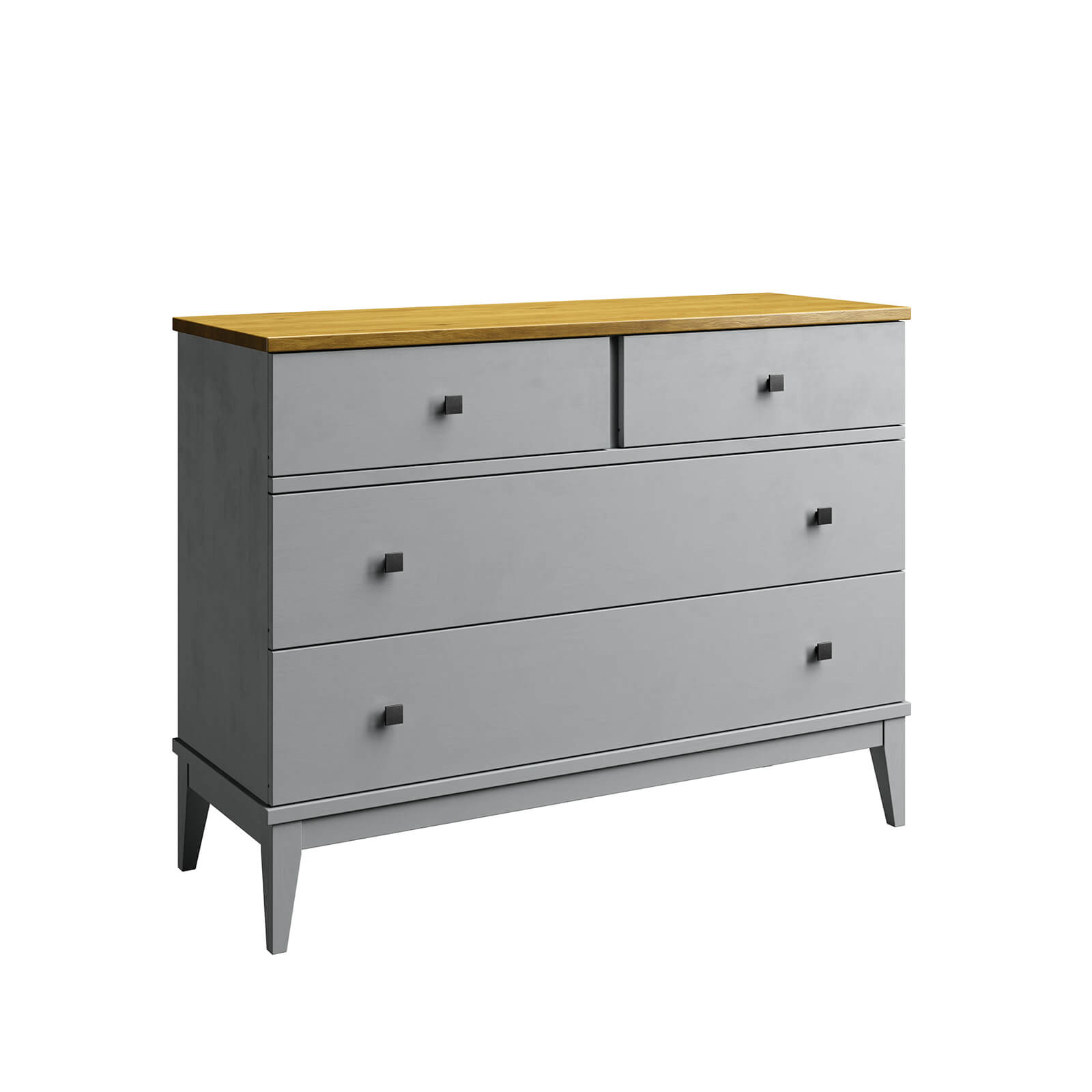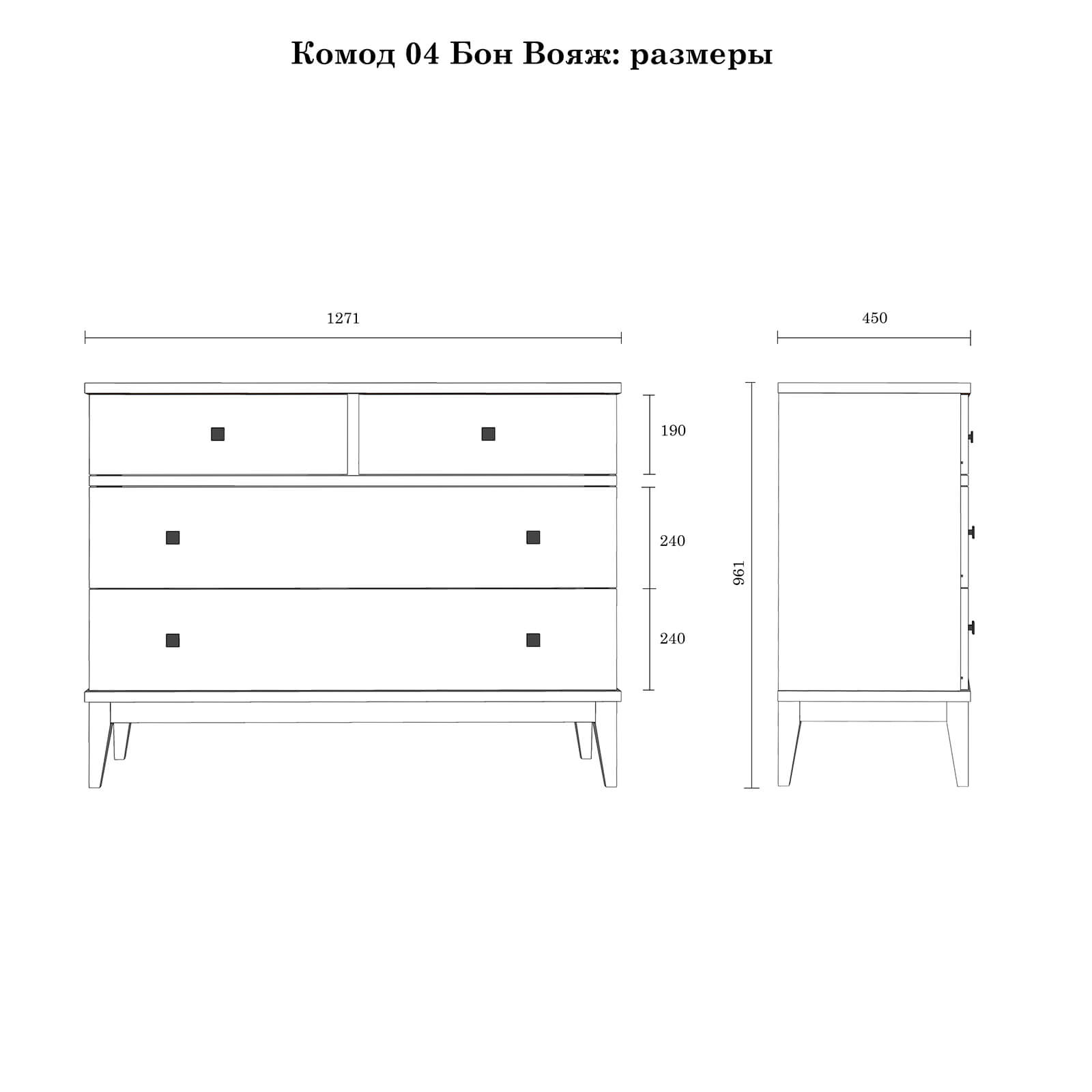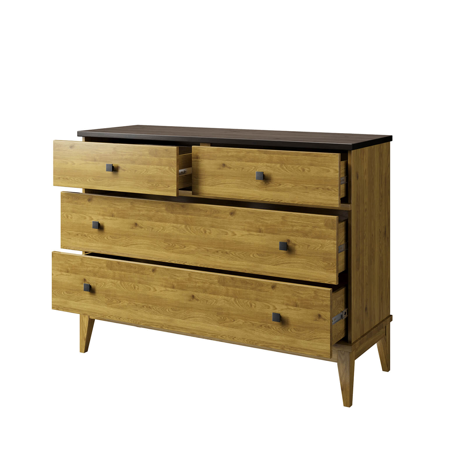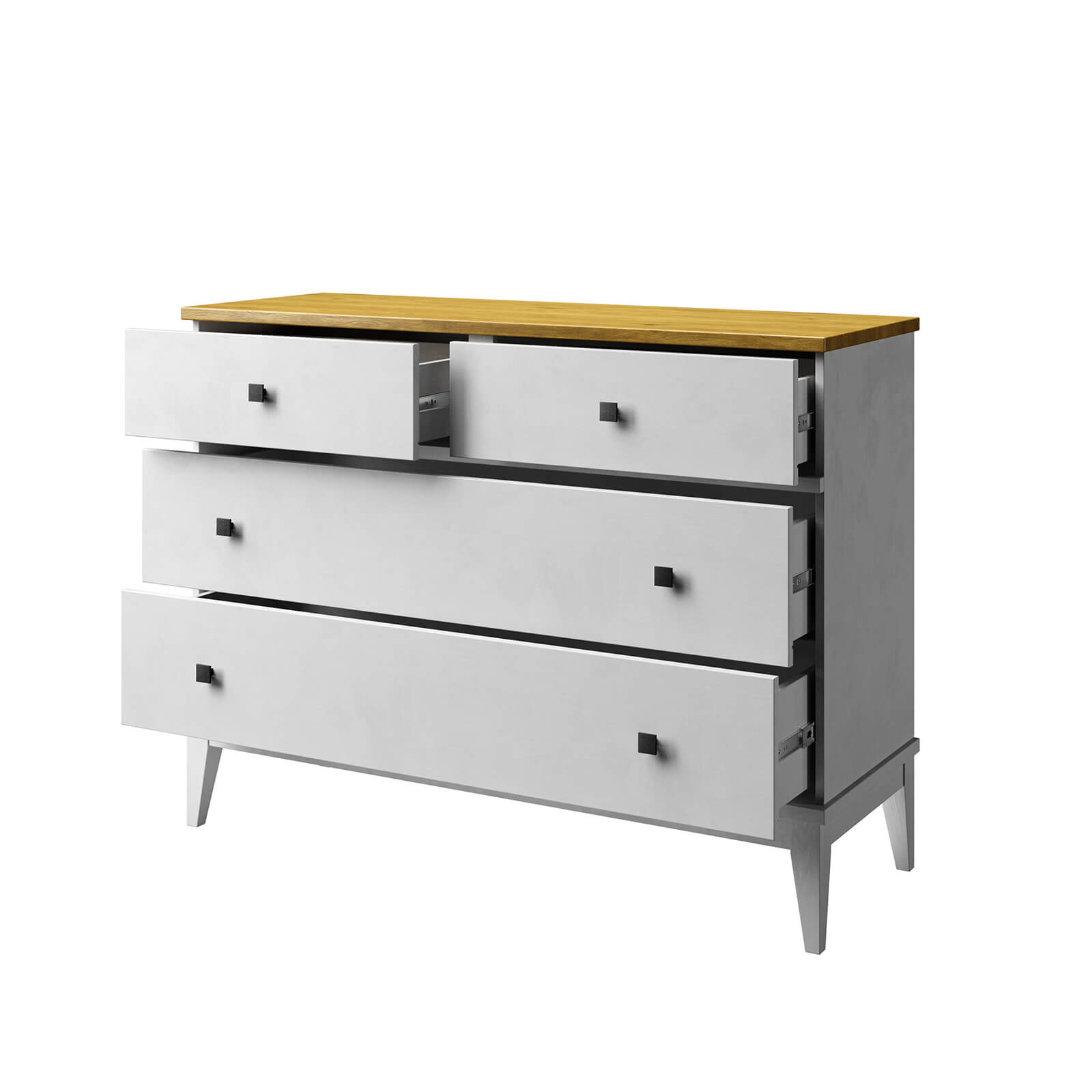Комод оснащен двумя широкими и и двумя узкими ящиками. Высокие ножки обеспечивают оптимальный доступ при уборке.