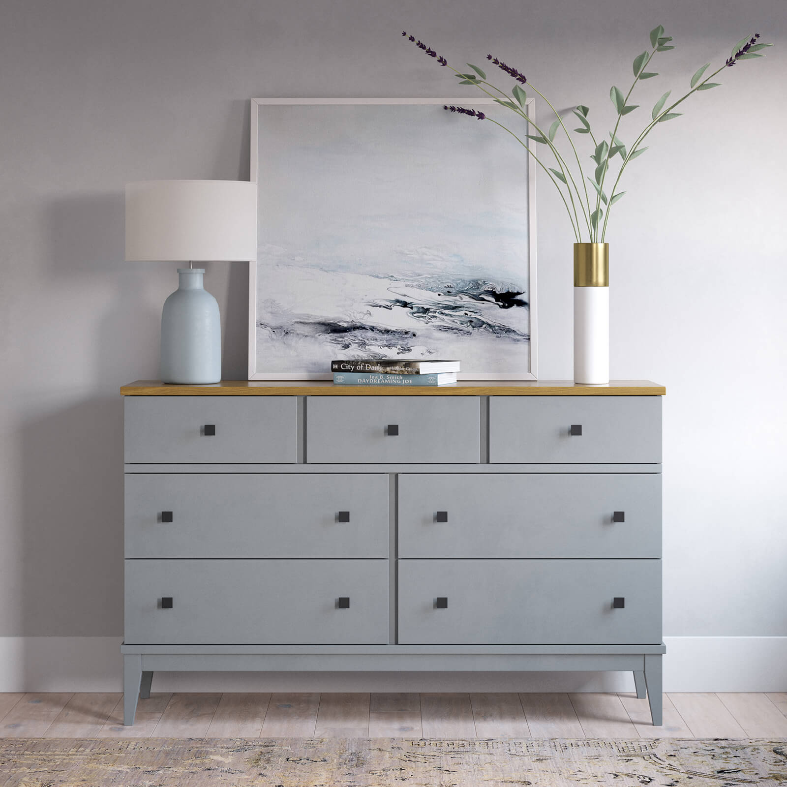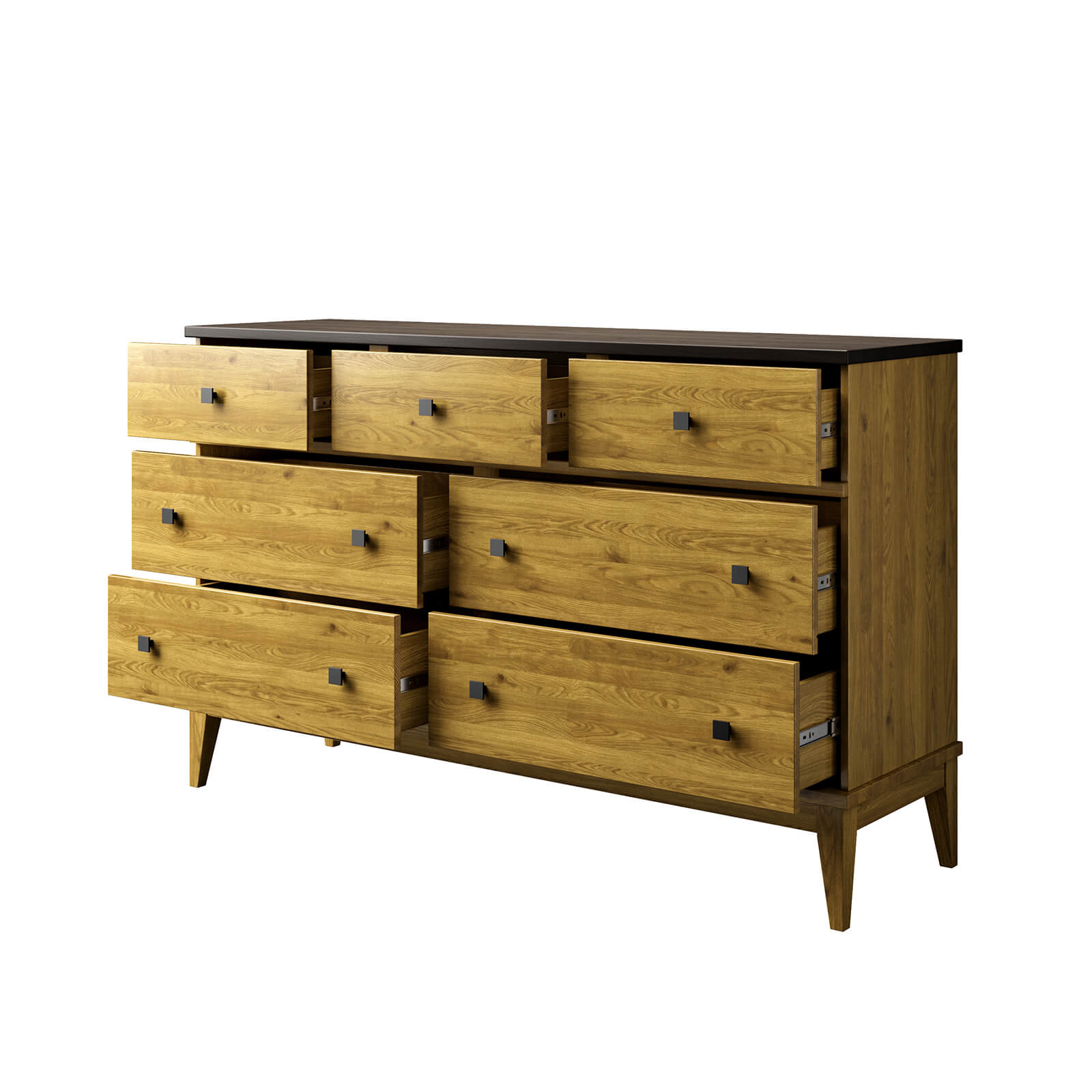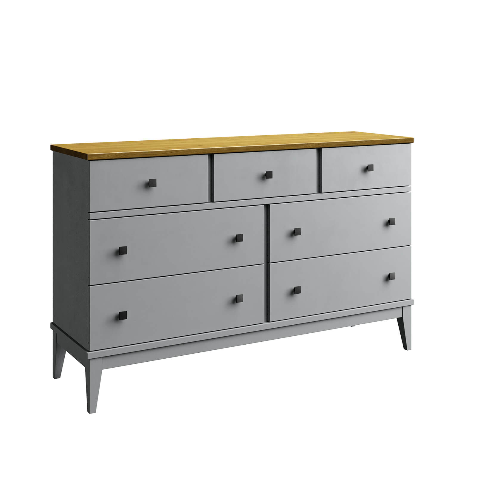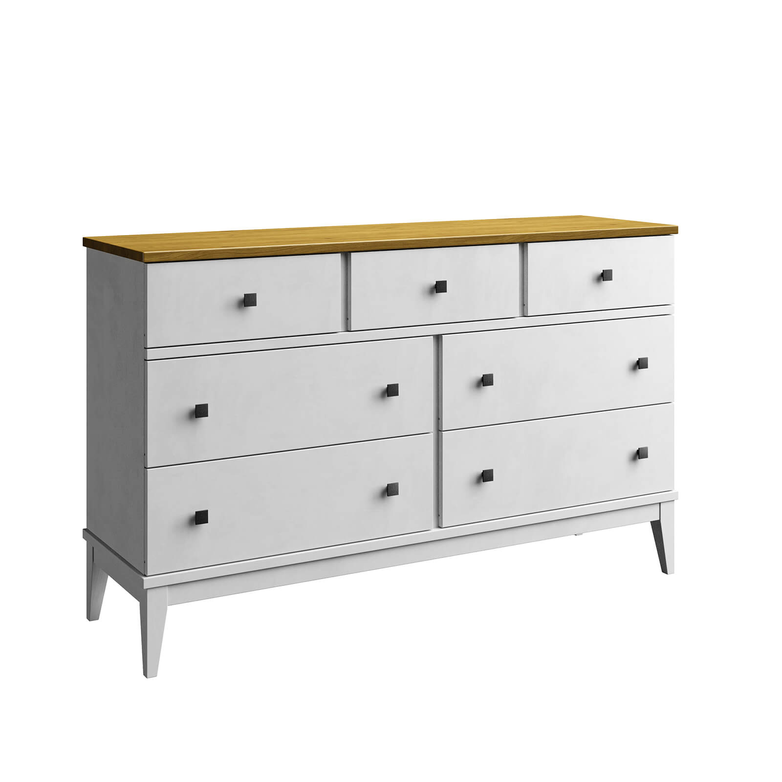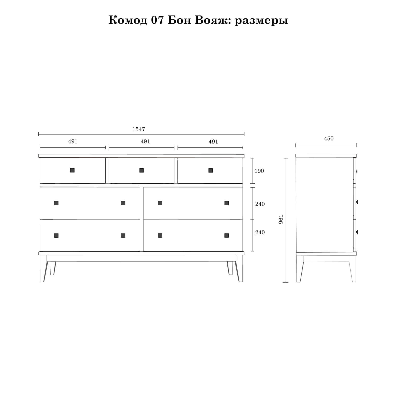 Комод оснащен четырьмя широкими и и тремя узкими ящиками. Высокие ножки обеспечивают оптимальный доступ при уборке.