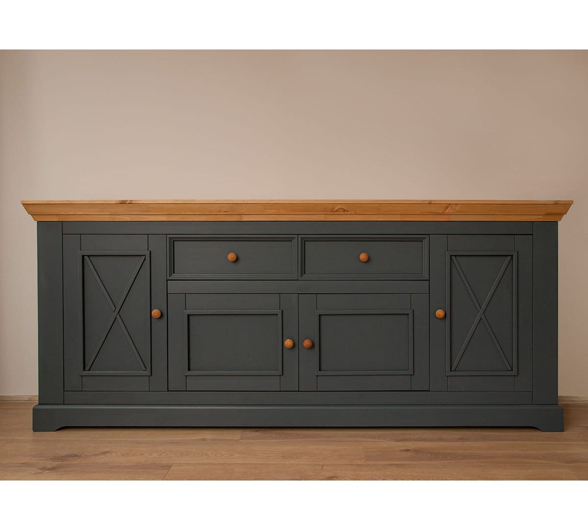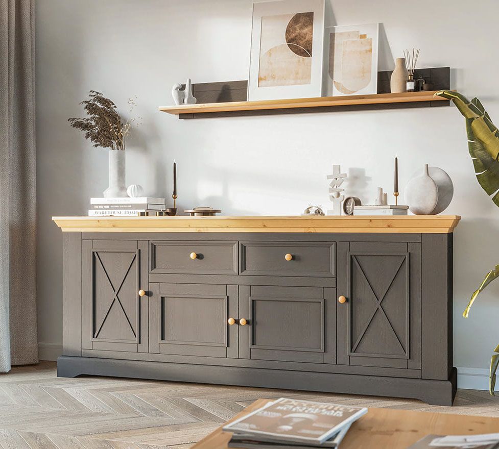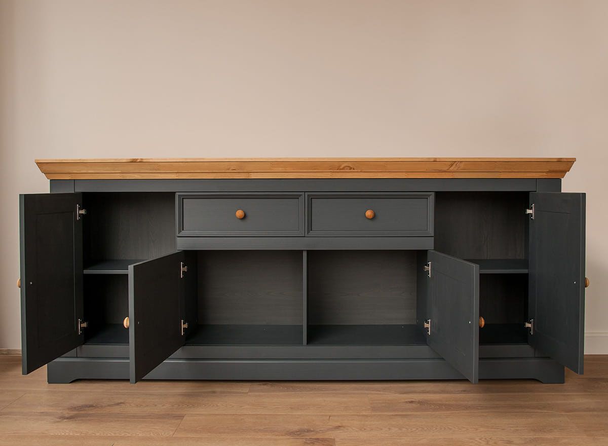 Комод Форест Графит 4 двери 2 ящика. Два выдвижных ящика на роликовых направляющих, четыре глухих дверки, за каждой высокой дверкой имеется деревянная полка.