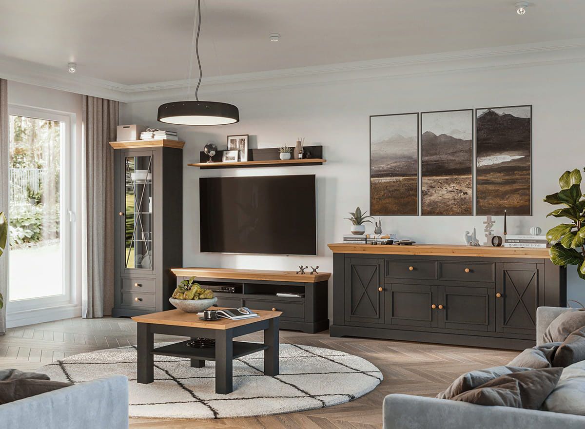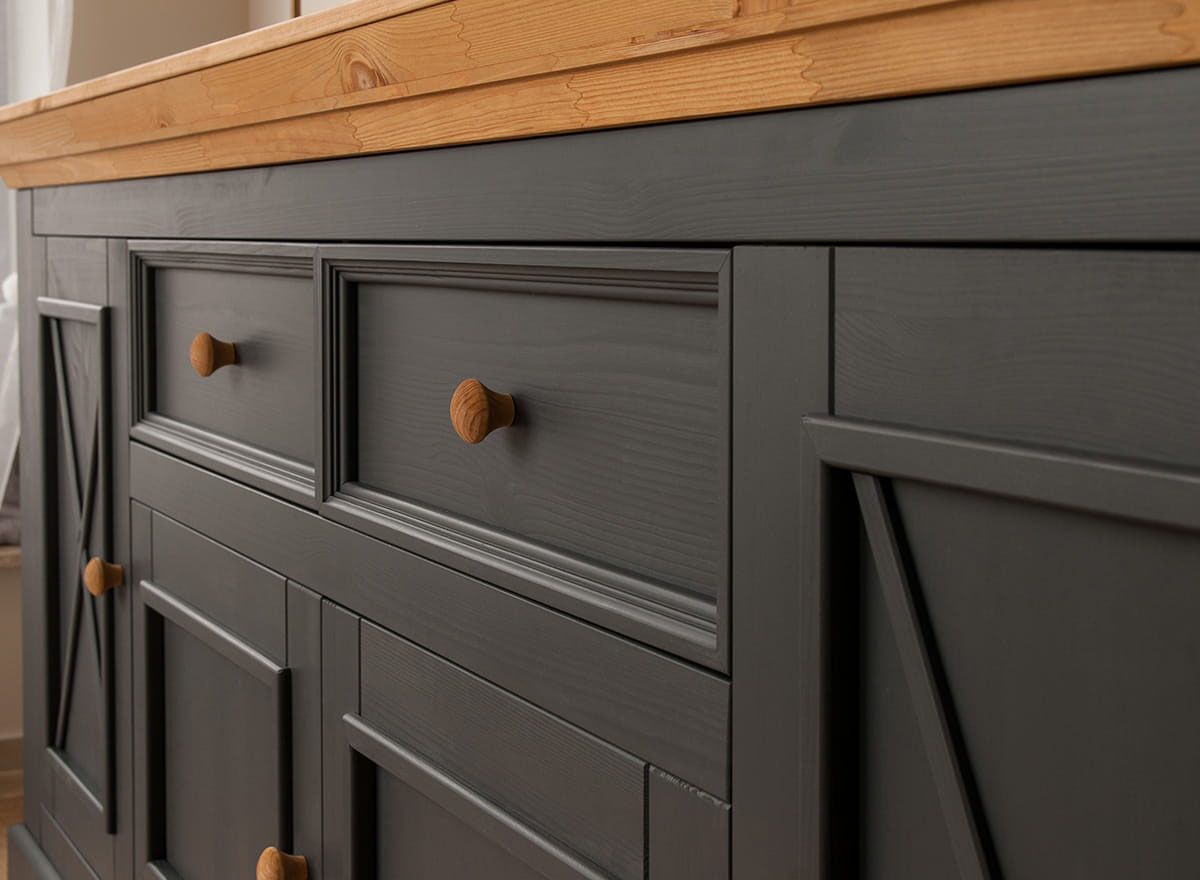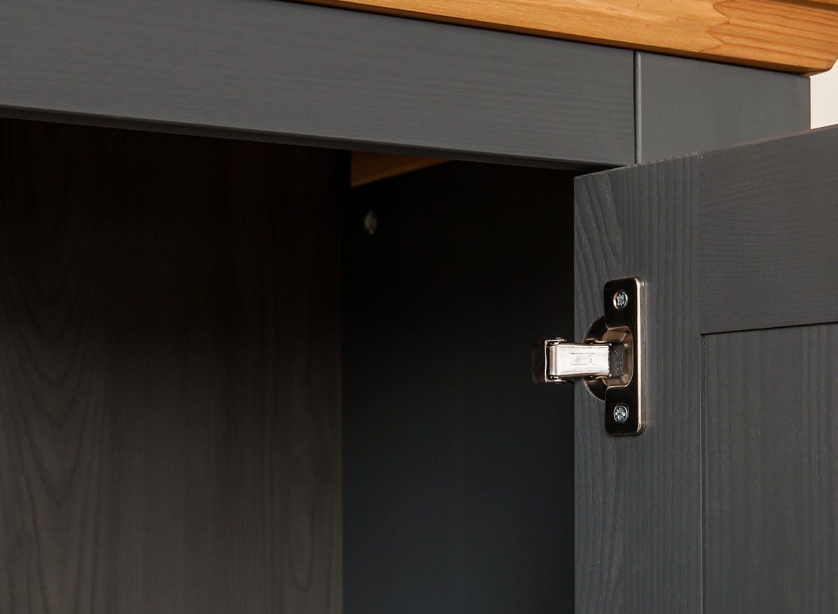 Комод Форест Графит 4 двери 2 ящика. Два выдвижных ящика на роликовых направляющих, четыре глухих дверки, за каждой высокой дверкой имеется деревянная полка.