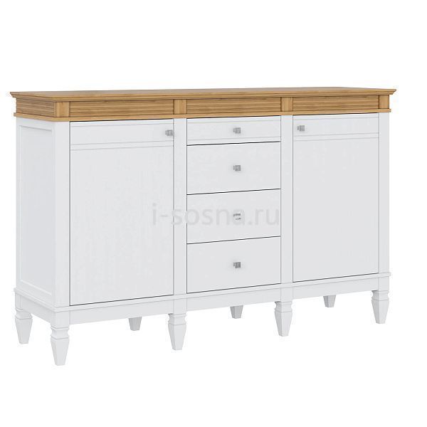 Комод оснащен двумя распашными дверками с полками внутри и четырьмя ящиками. Фурнитура на дверях и ящиках с доводчиками. Высокие ножки обеспечивают оптимальный доступ при уборке.