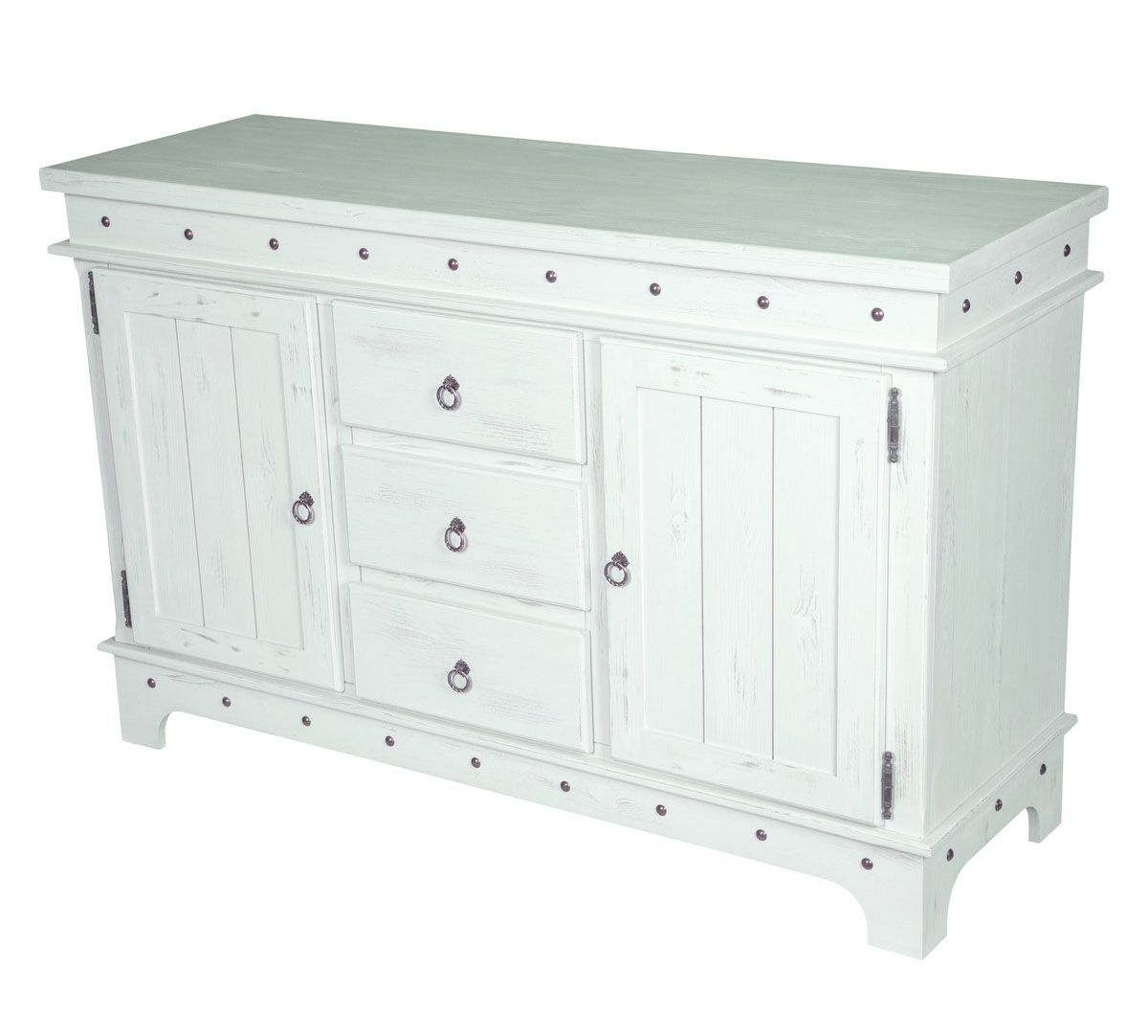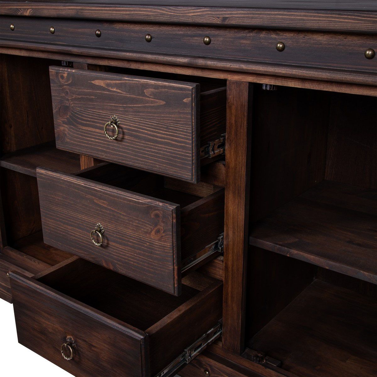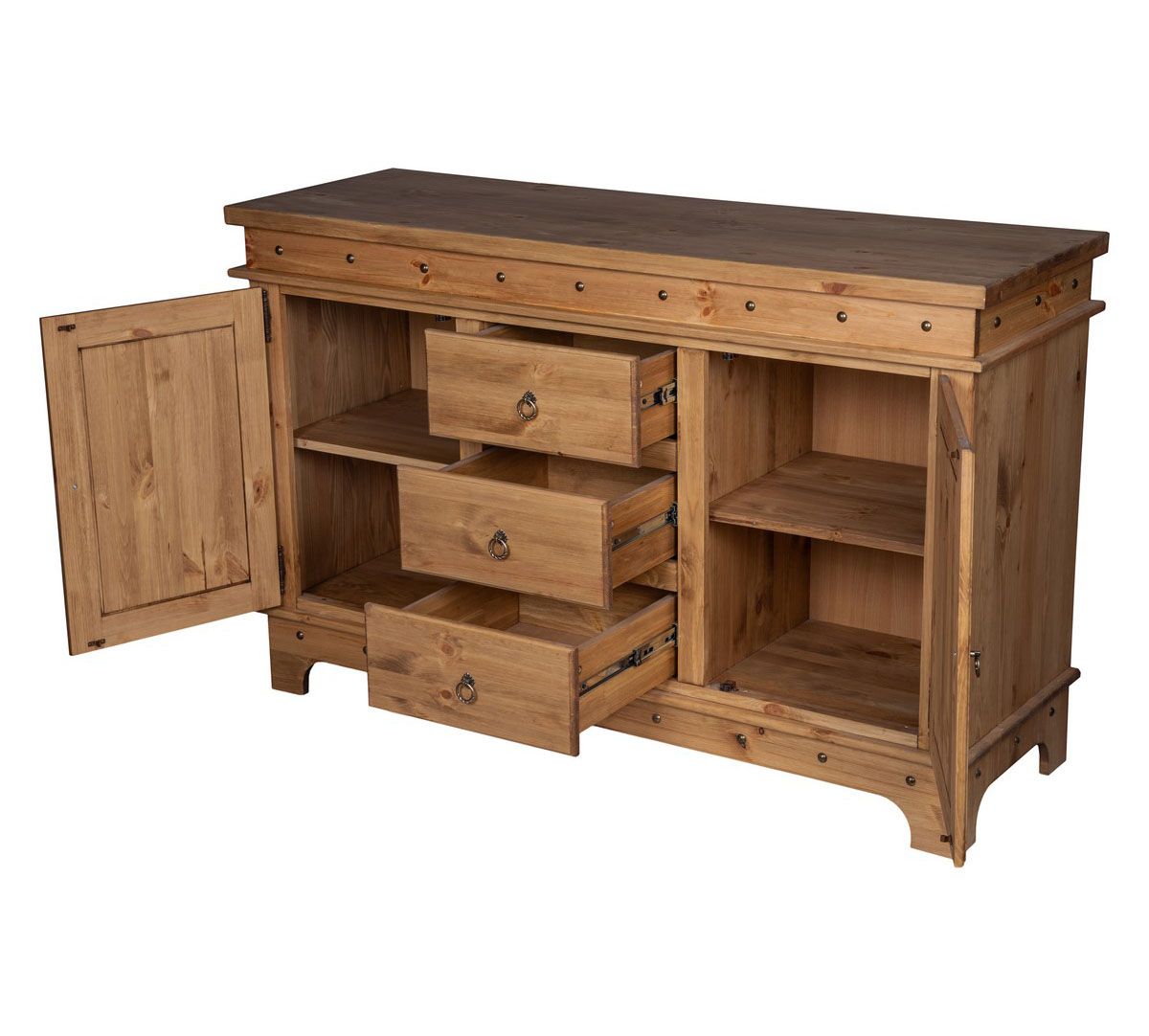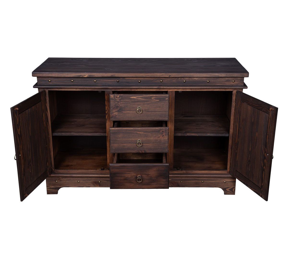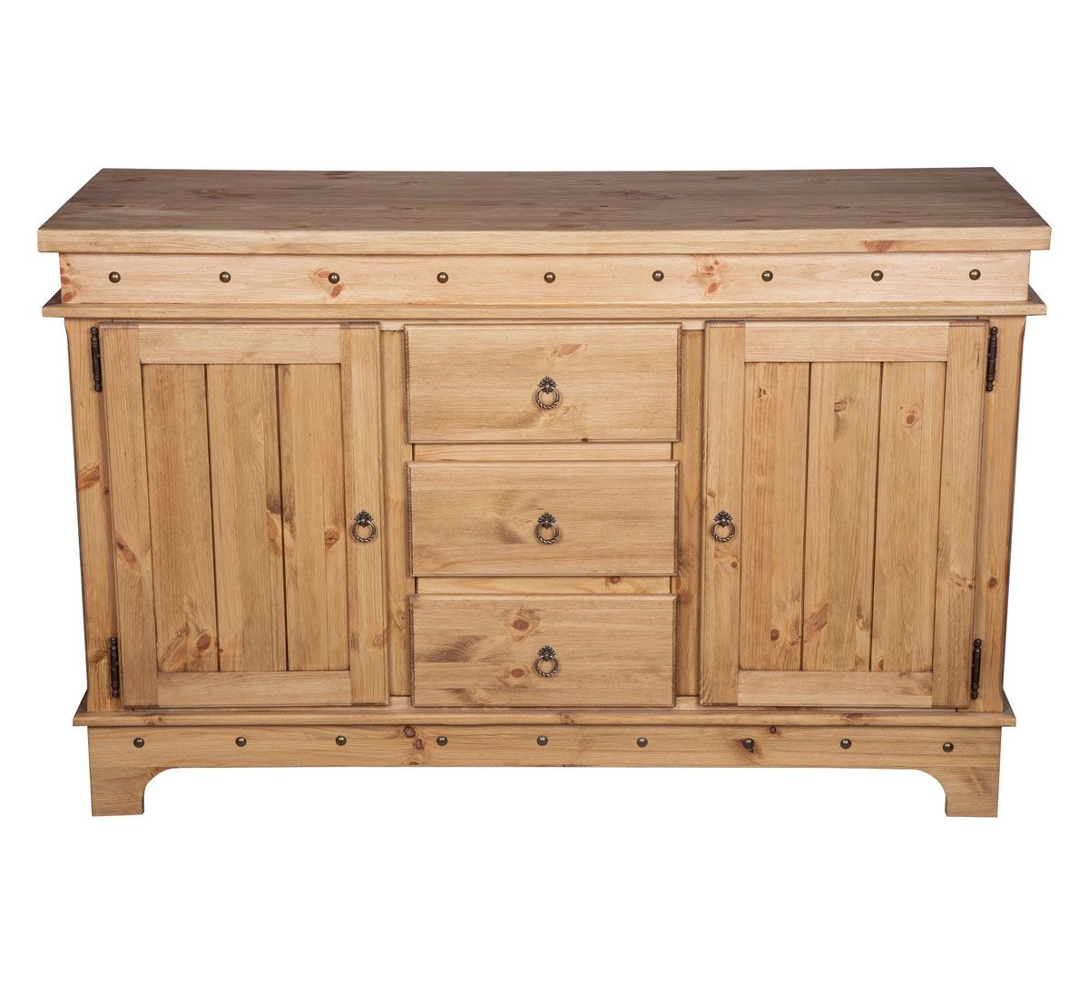 Трехдверный комод из массива сосны в стиле кантри Шале 23. Комод Шале 23 оборудован 2-мя дверями и 3-мя ящиками. Мебель изготовлена полностью из натуральных материалов. Особенности дизайна: штыревые петли, на деревянных фасадах сделаны декоративные пропилы, в фасадах со стеком установлена декоративная английская решетка. Ручки-кольца и декоративные гвозди цвета латунь.