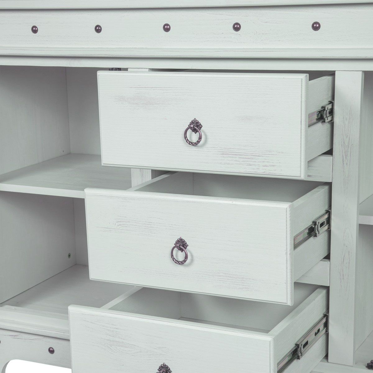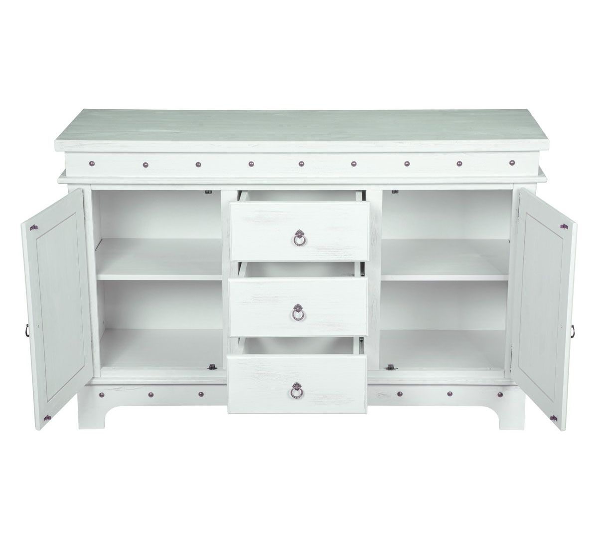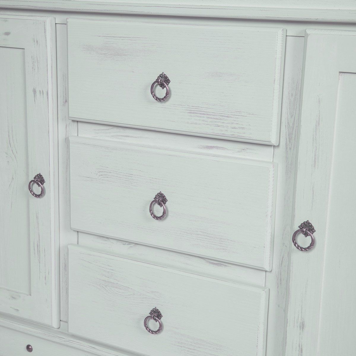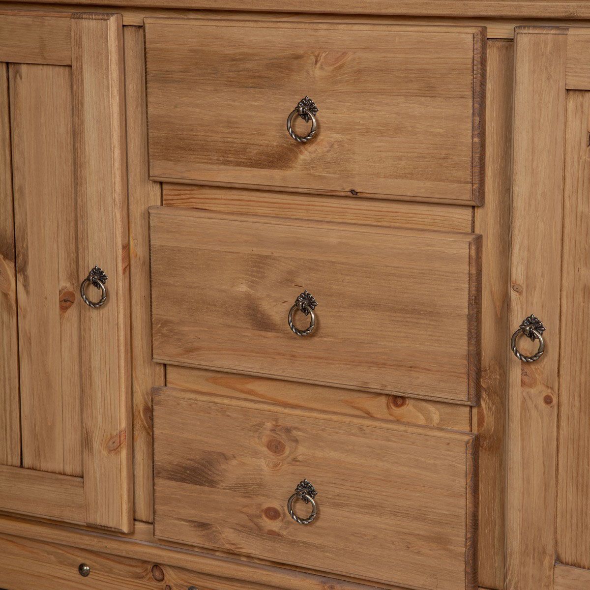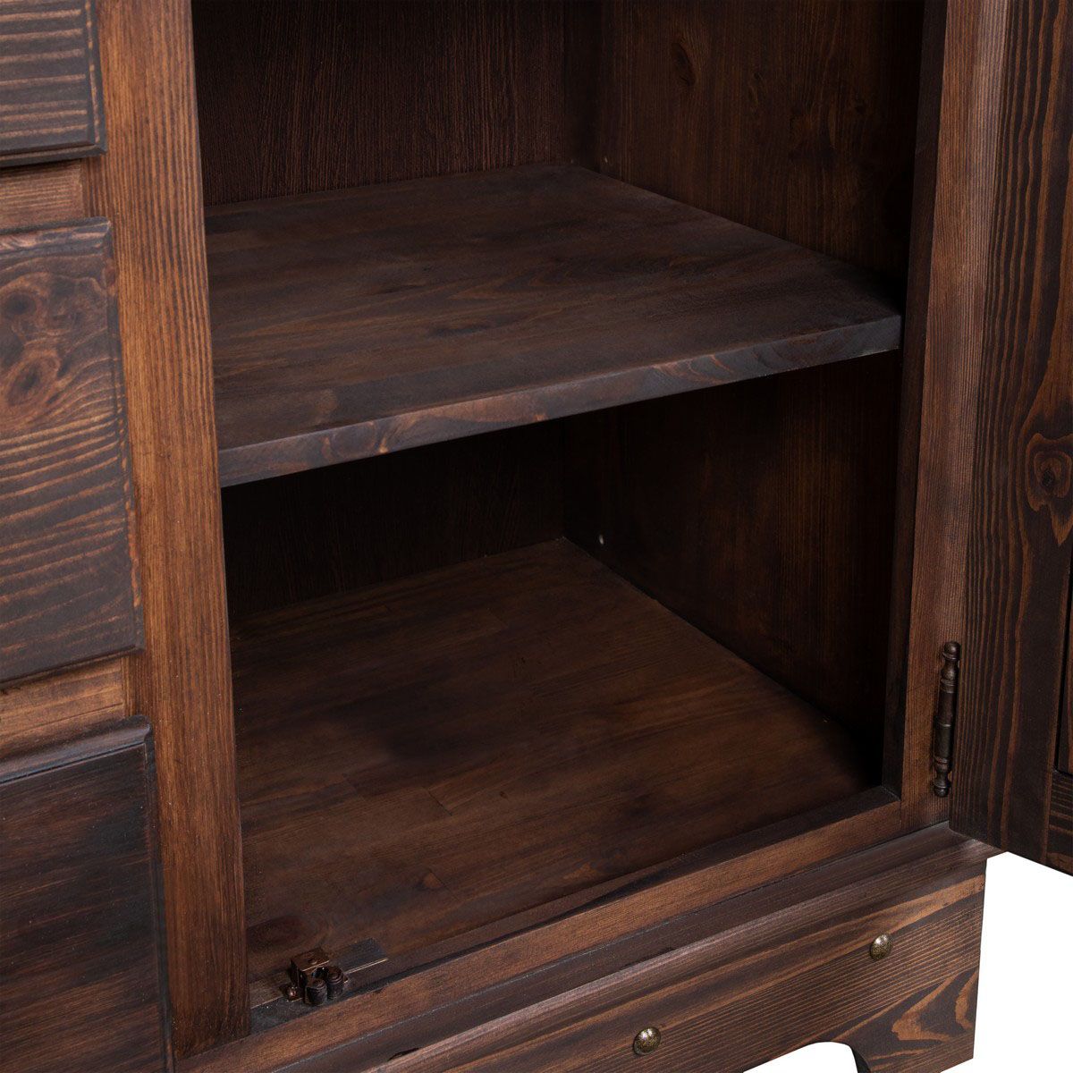 Трехдверный комод из массива сосны в стиле кантри Шале 23. Комод Шале 23 оборудован 2-мя дверями и 3-мя ящиками. Мебель изготовлена полностью из натуральных материалов. Особенности дизайна: штыревые петли, на деревянных фасадах сделаны декоративные пропилы, в фасадах со стеком установлена декоративная английская решетка. Ручки-кольца и декоративные гвозди цвета латунь.