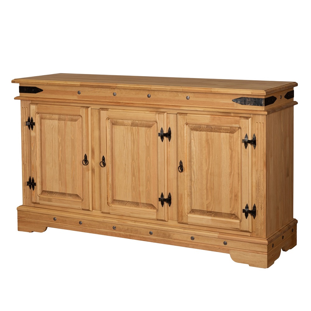 Трехстворчатый комод Викинг 01, выполненный в стиле кантри. Мебель покрыта маслом на водной основе. На выбор представлено 3 цвета: орех, белый, старение. В производство идет массив сосны и фурнитура ручной работы – это гарантирует надежность мебели и длительный срок ее эксплуатации. Комод можно использовать как тумбу под телевизор.
