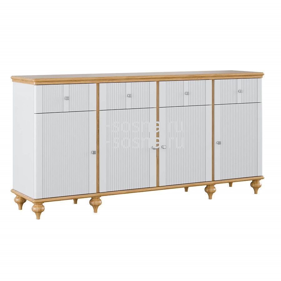 Комод оснащен четырьмя распашными дверками с полками внутри и четырьмя ящиками. Фурнитура на дверях и ящиках с доводчиками. Высокие ножки обеспечивают оптимальный доступ при уборке.