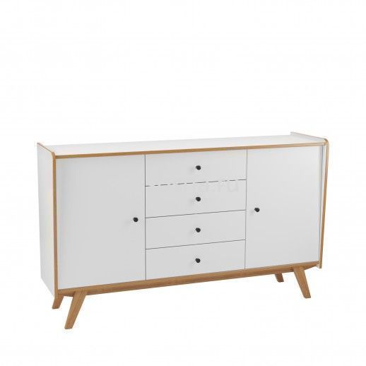 Комод из массива сосны имеет 4 ящика на шариковых направляющих с доводчиками и 2 дверки. За дверкой расположена полка. Петли дверки с доводчиками. Покрытие - укрывистый белый лак, структура древесины почти не просматривается. Выдвижные ящики на направляющих полного выката с доводчиками.