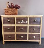 Фасад выполнен из бессучковой сосны категории Экстра толщиной 20 мм. Корпус, цоколь - из массива сосны категории А высшего качества без дефектов и чёрных сучков толщиной 18 мм. Задняя стенка - из берёзовой фанеры толщиной 3 мм. Дно ящика - из берёзовой фанеры толщиной 5 мм.