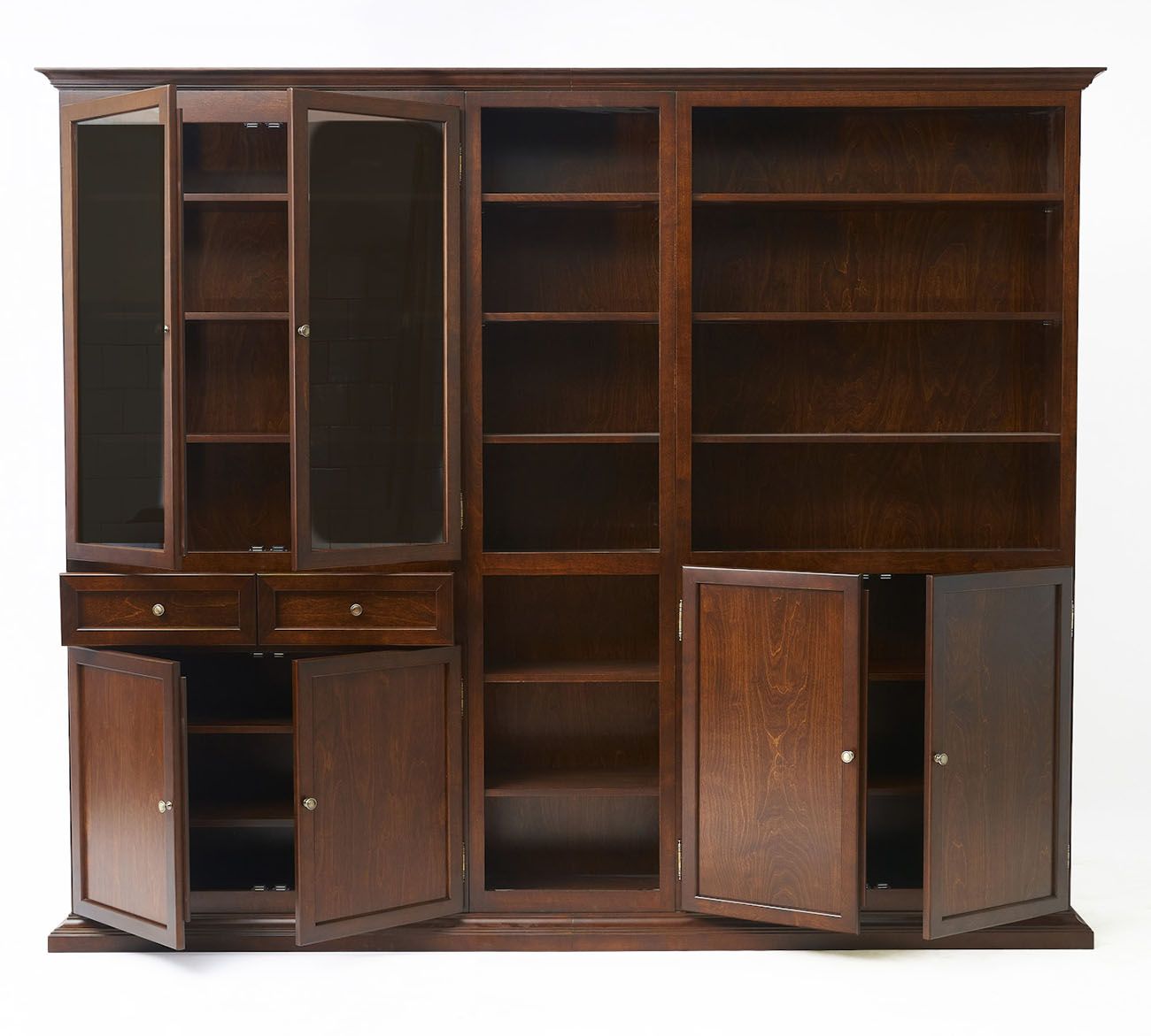 Библиотека из массива березы. Комплект состоит из одно и двухдверных шкафов. Модули между собой соединяются стяжками, а цоколь и корона крепятся на саморезы. Цоколи оснащены специальными ножками для регулирования по высоте. Каждый шкаф укомплектован фурнитурой для сборки и схемой сборки.