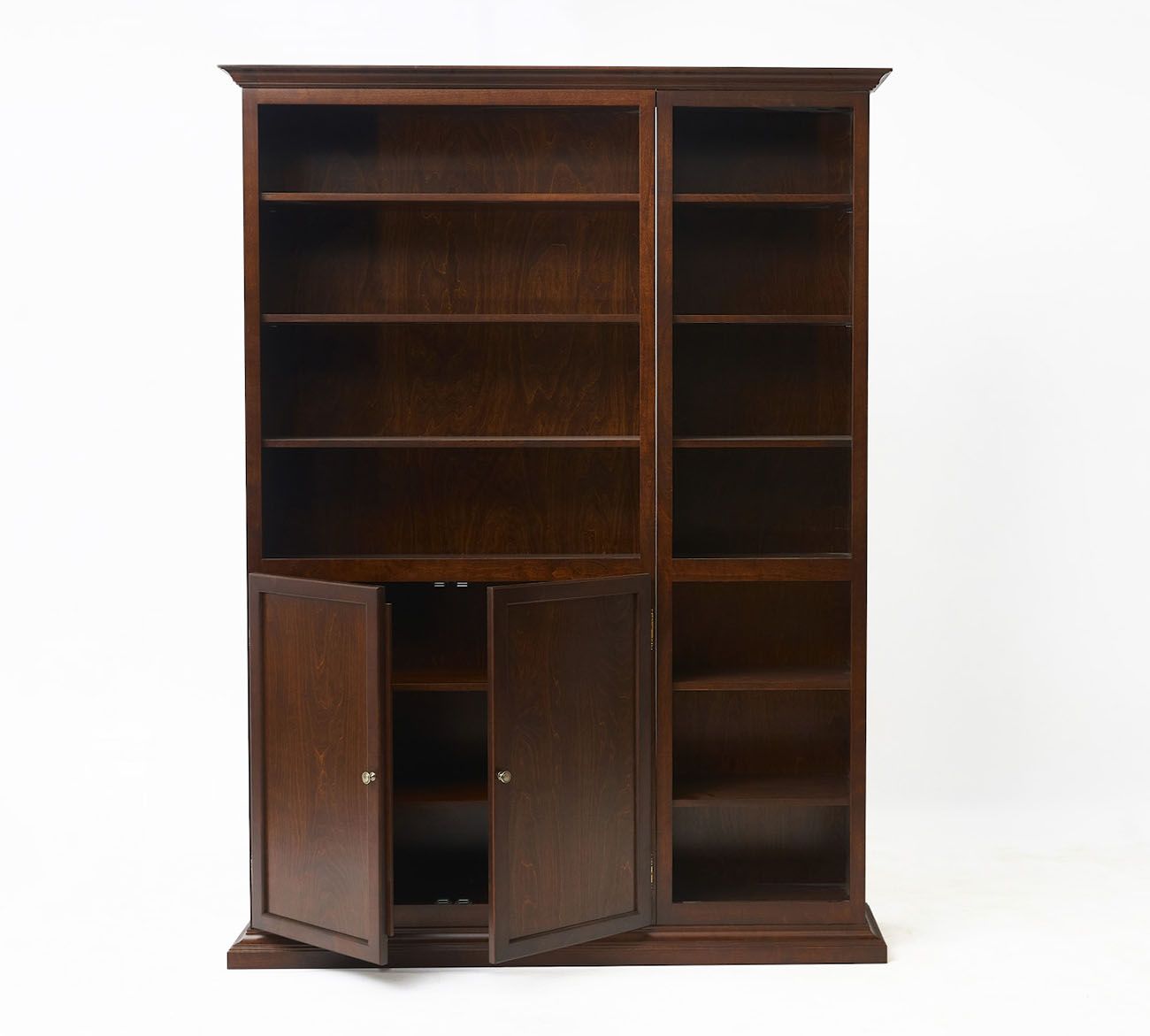 Библиотека из массива березы. Комплект состоит из одно и двухдверных шкафов. Модули между собой соединяются стяжками, а цоколь и корона крепятся на саморезы. Цоколи оснащены специальными ножками для регулирования по высоте. Каждый шкаф укомплектован фурнитурой для сборки и схемой сборки.