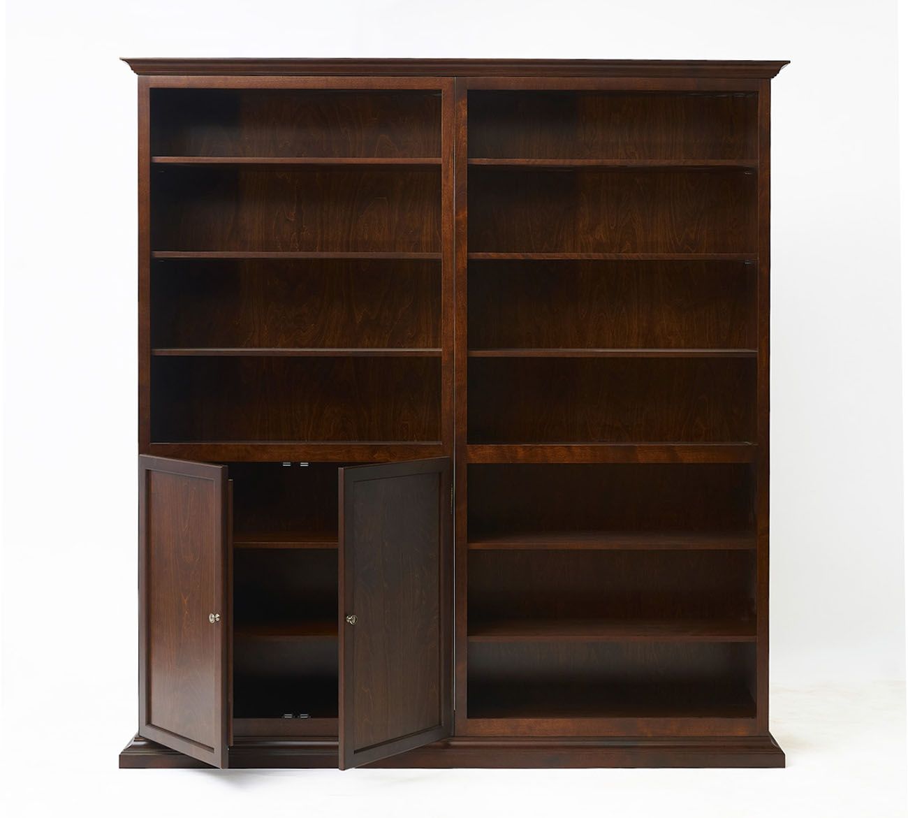 Библиотека из массива березы. Комплект состоит из одно и двухдверных шкафов. Модули между собой соединяются стяжками, а цоколь и корона крепятся на саморезы. Цоколи оснащены специальными ножками для регулирования по высоте. Каждый шкаф укомплектован фурнитурой для сборки и схемой сборки.