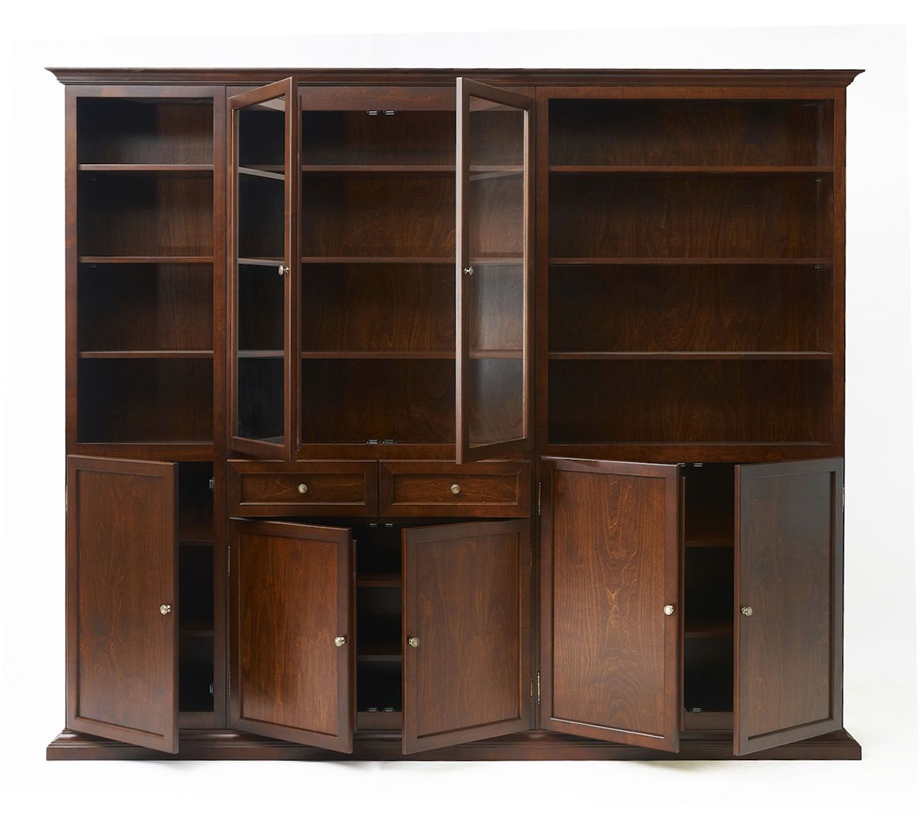 Библиотека из массива березы. Комплект состоит из одно и двухдверных шкафов. Модули между собой соединяются стяжками, а цоколь и корона крепятся на саморезы. Цоколи оснащены специальными ножками для регулирования по высоте. Каждый шкаф укомплектован фурнитурой для сборки и схемой сборки.