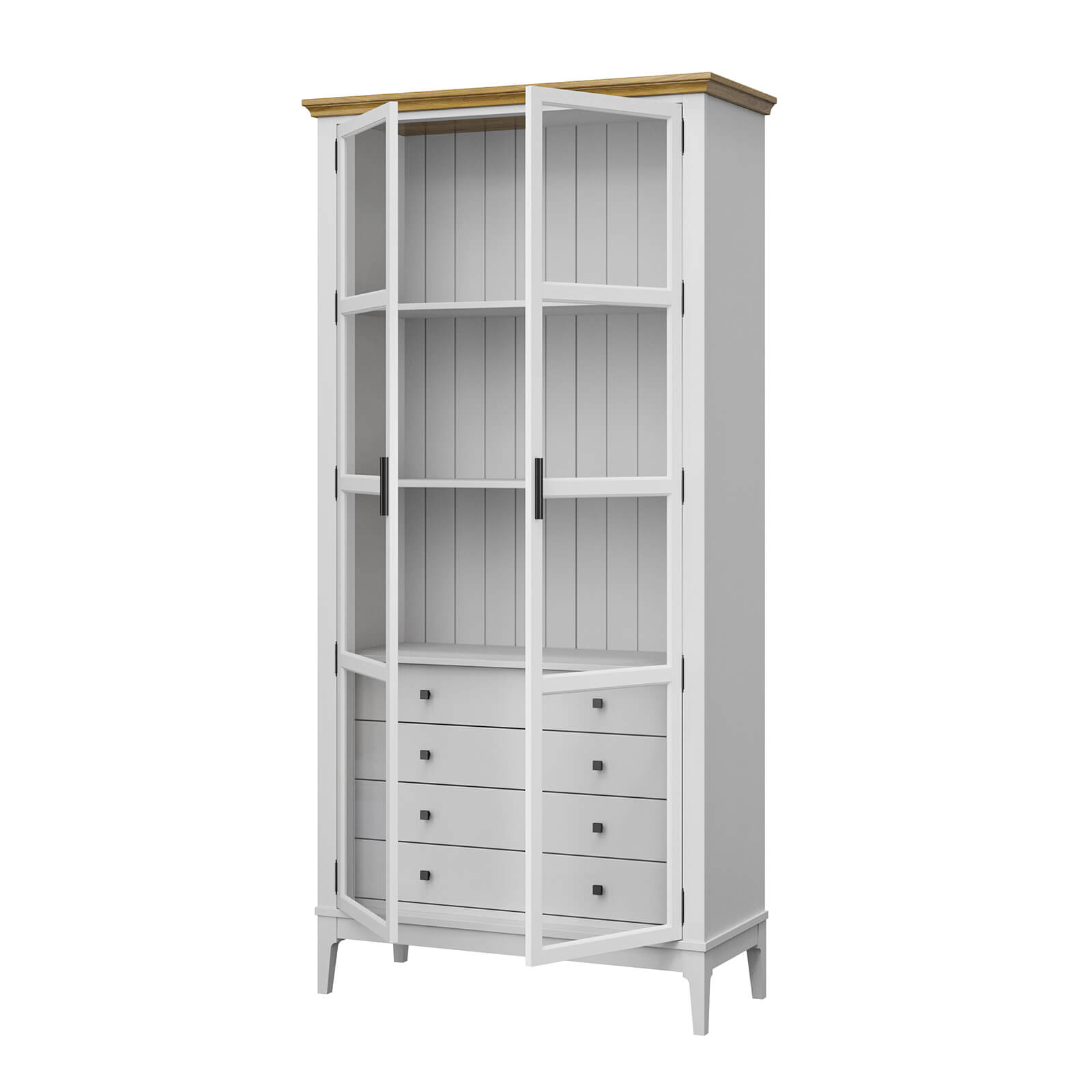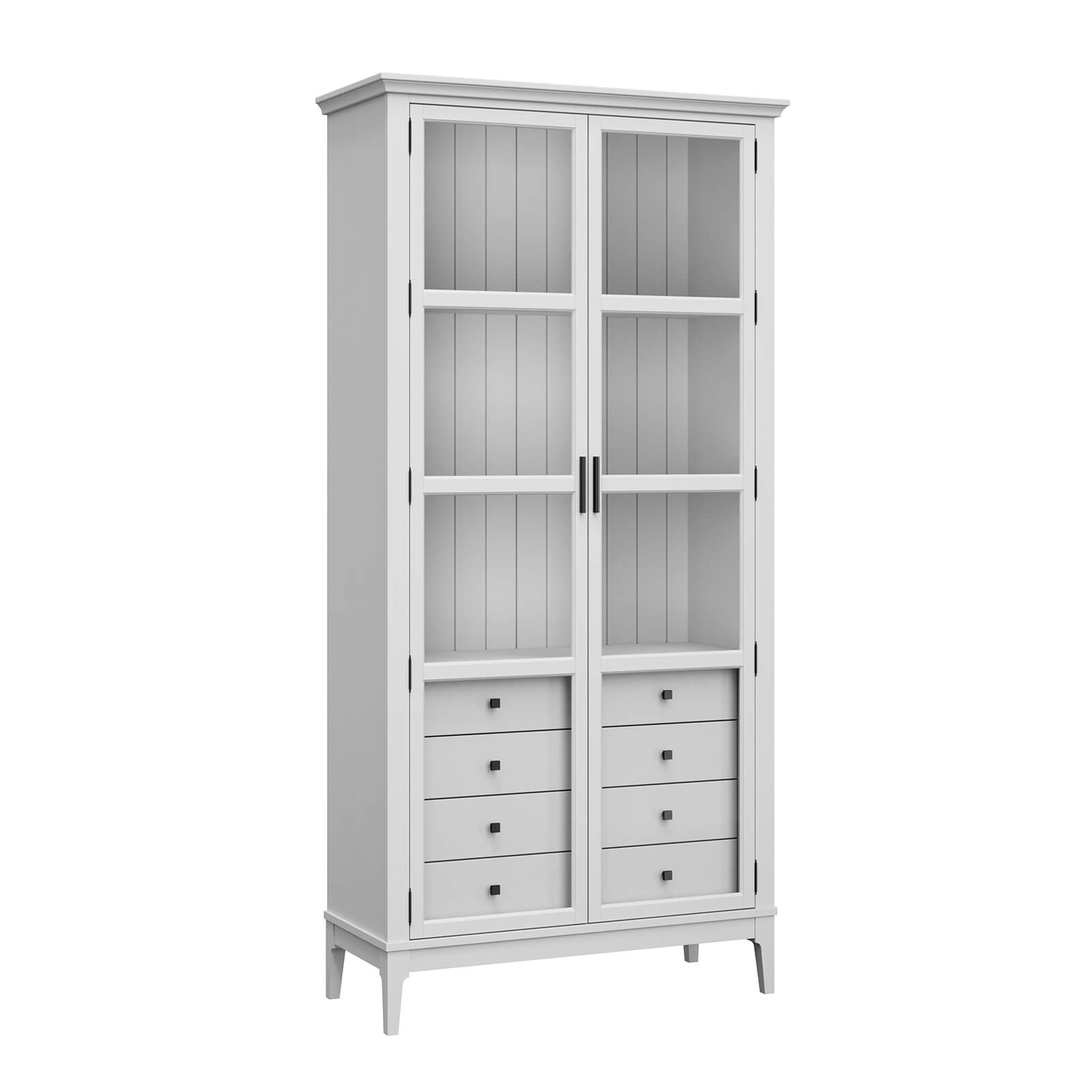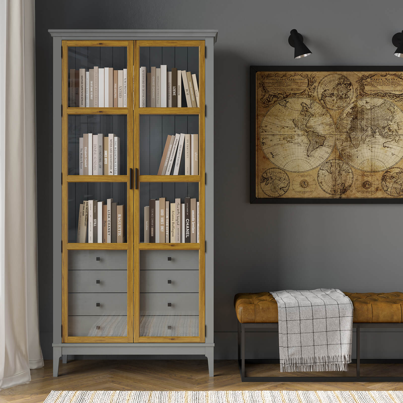 Шкаф для книг «Квадро-С» 220/04 из массива сосны представляет собой высокий шкаф с распашными, стеклянными дверями. Внутри четыре ящика и три полки.