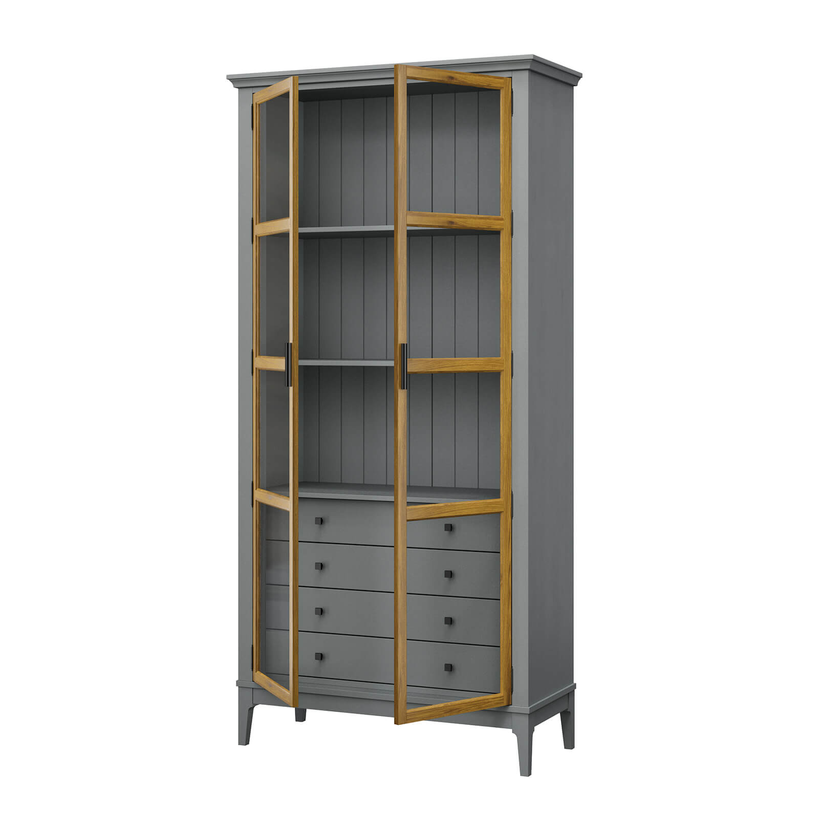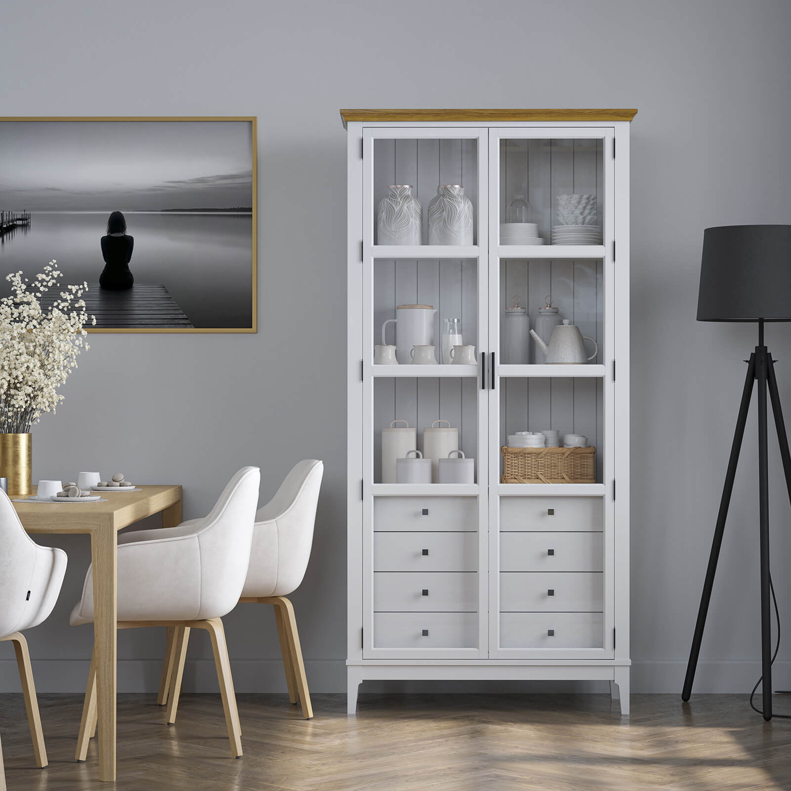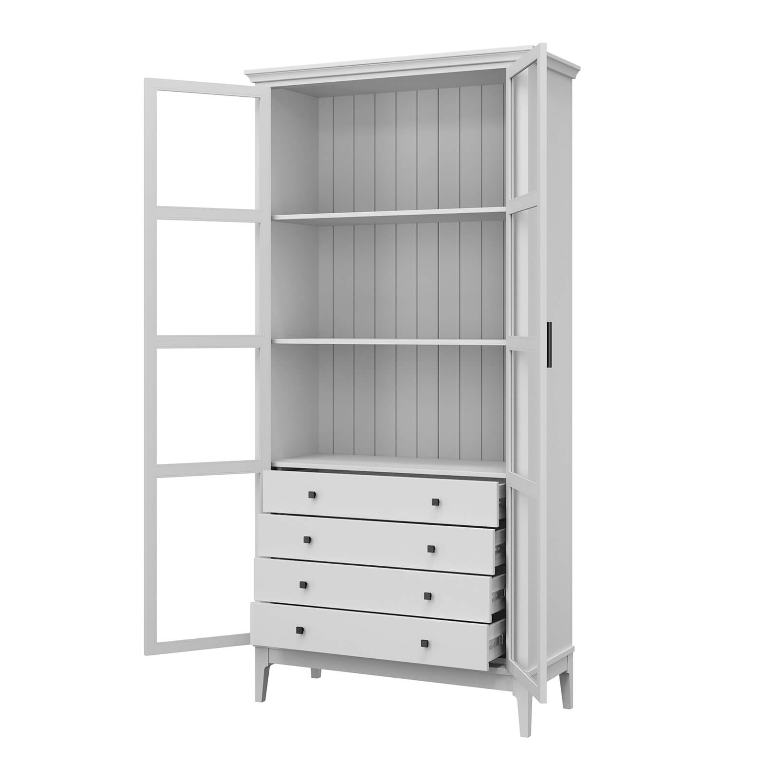 Шкаф для книг «Квадро-С» 220/04 из массива сосны представляет собой высокий шкаф с распашными, стеклянными дверями. Внутри четыре ящика и три полки.