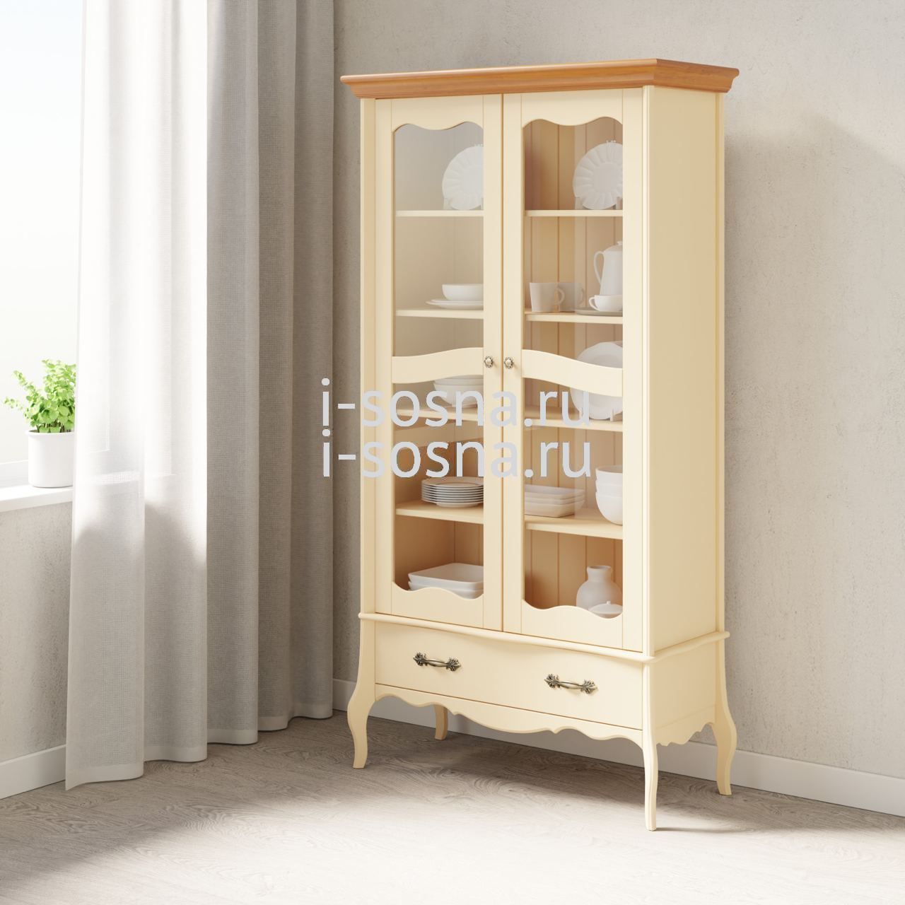 Шкаф с двумя стеклянными дверями. Шторы в комплект не входят. Шкаф имеет одно отделение за дверями, ящик на направляющих с доводчиками, полку и штангу под ней для одежды. В варианте цвета бежевый воск/антик в цвет антик окрашен карниз шкафа.