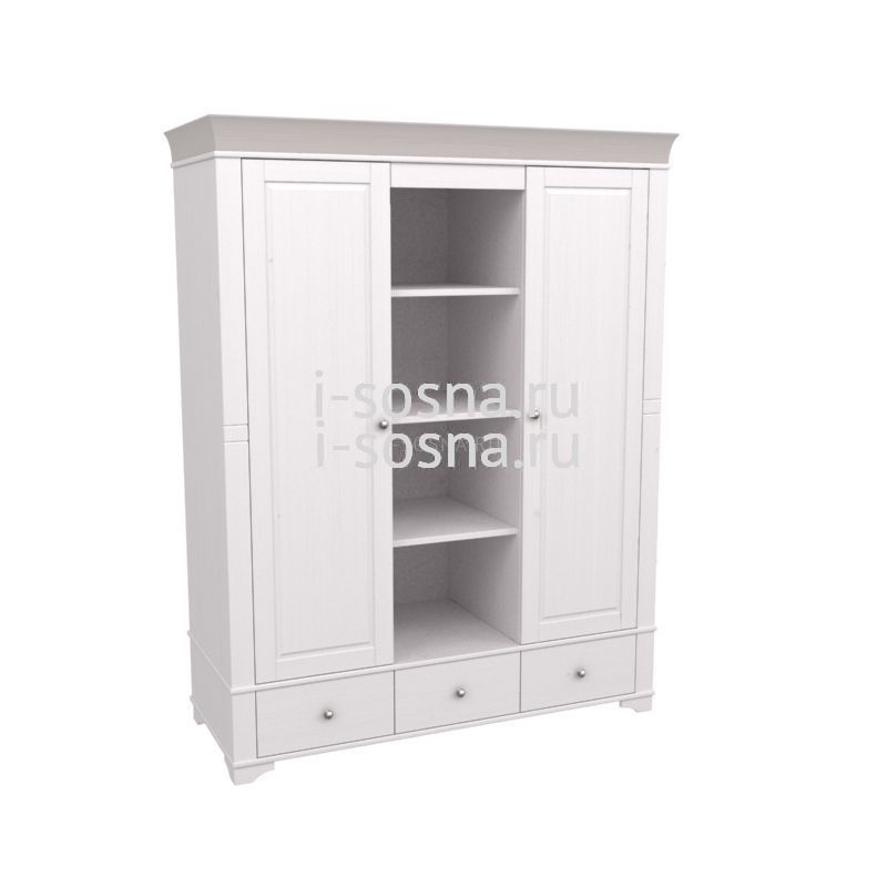 Шкаф Бейли имеет 3 отделения: правое и левое отделение с полкой и штангой под ней, среднее отделение имеет 3 полки, которые регулируются по высоте. Под каждым отделением имеется выдвижной ящик на роликовых направляющих. Дополнительно можно купить ящики для шкафа.