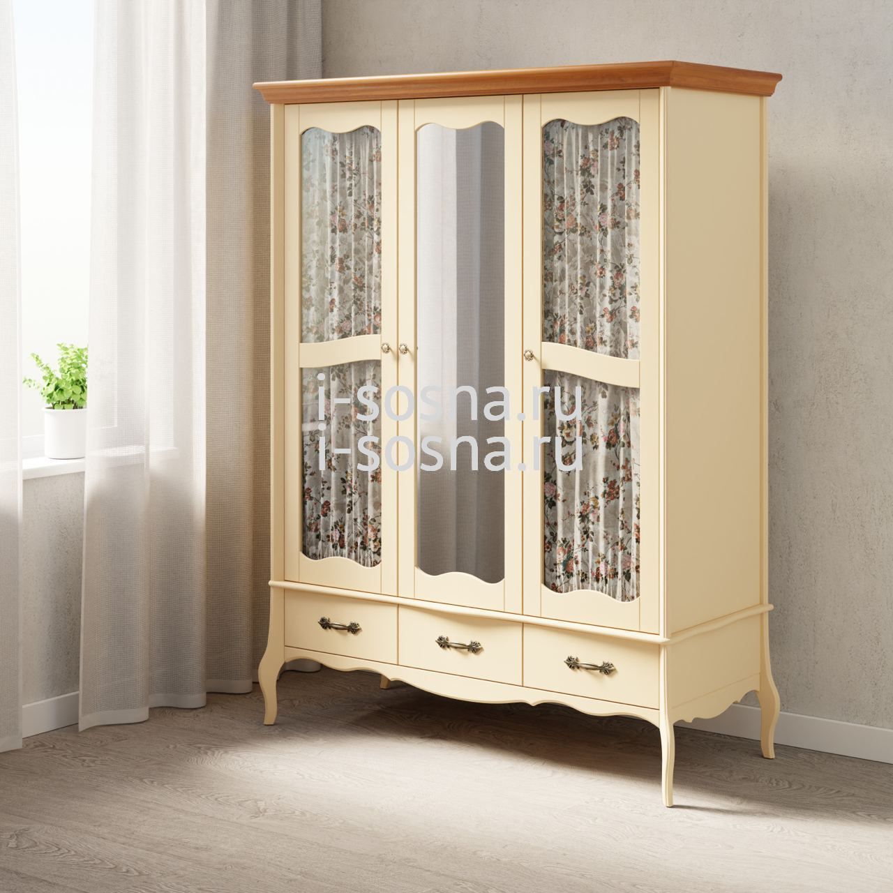 Шкаф с двумя стеклянными дверями и одной зеркальной дверью. Шторы в комплект не входят. Шкаф имеет два отделения, правое узкое отделение с полками, левое широкое с полкой и штангой для одежды. Три ящика на направляющих Blum с доводчиками. В варианте цвета бежевый воск/антик в цвет антик окрашен карниз шкафа.