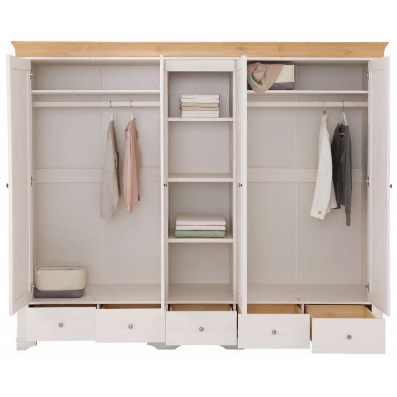 Шкаф имеет 3 отделения: правое и левое широкие отделения с полкой и штангой под ней, среднее широкое отделение имеет 3 полки, которые регулируются по высоте. Под каждой дверью имеется выдвижной ящик на роликовых направляющих