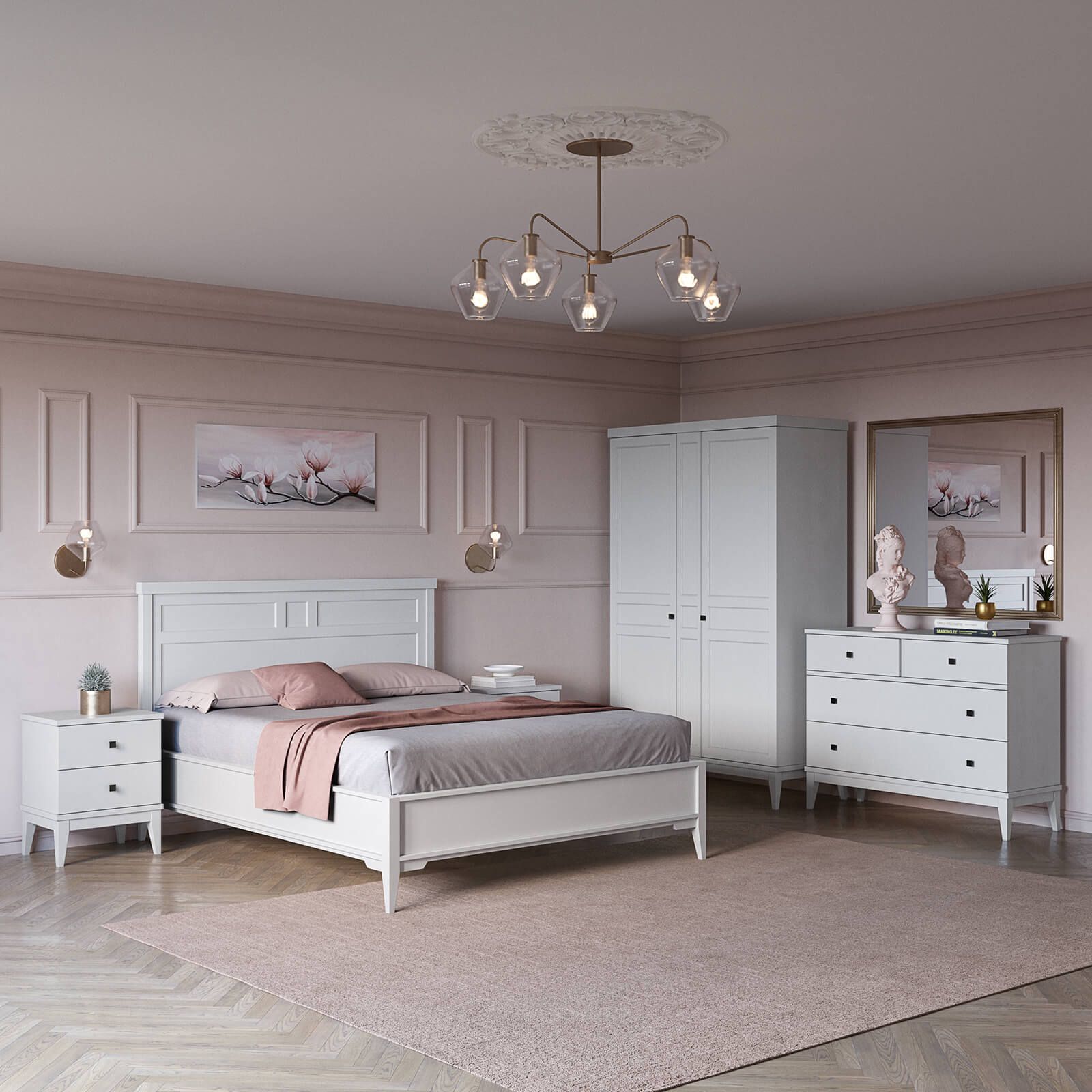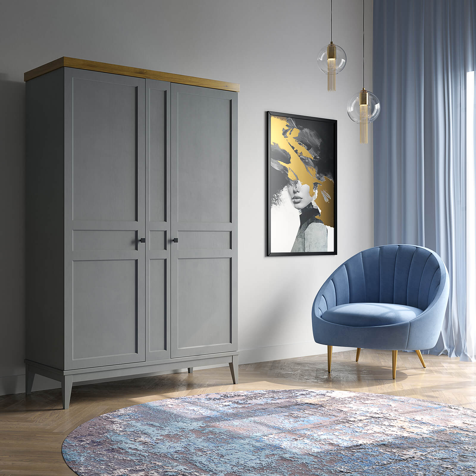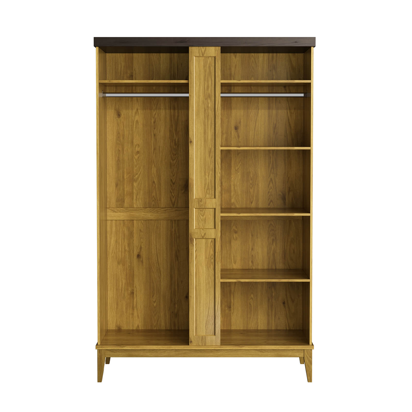 Шкаф оснащен распашными дверями, которые удобно открываются, предоставляя легкий доступ к содержимому. Внутреннее пространство шкафа продумано до мелочей: здесь достаточно места для хранения одежды, постельного белья или других вещей. На высоких ножках шкаф визуально "поднимает" пространство, что создает ощущение легкости и позволяет легко очищать полы под ним.