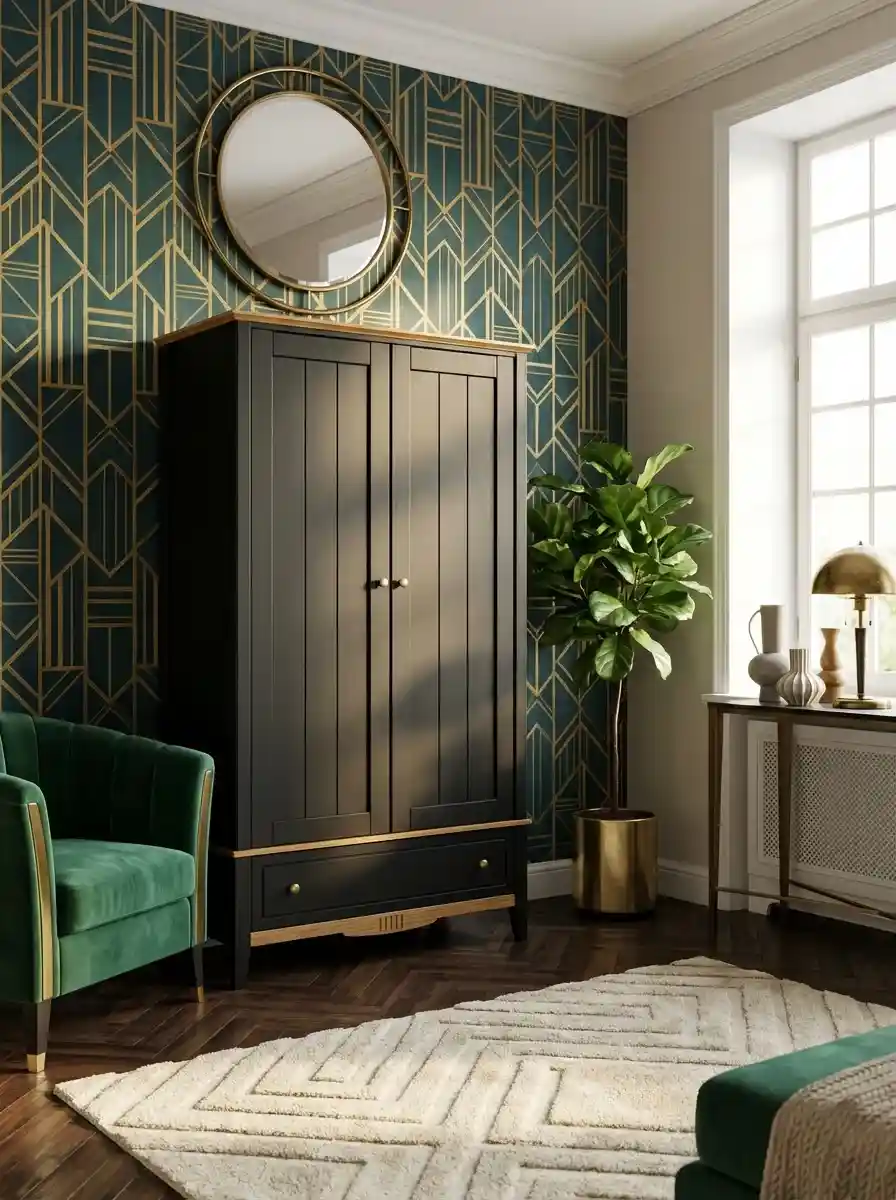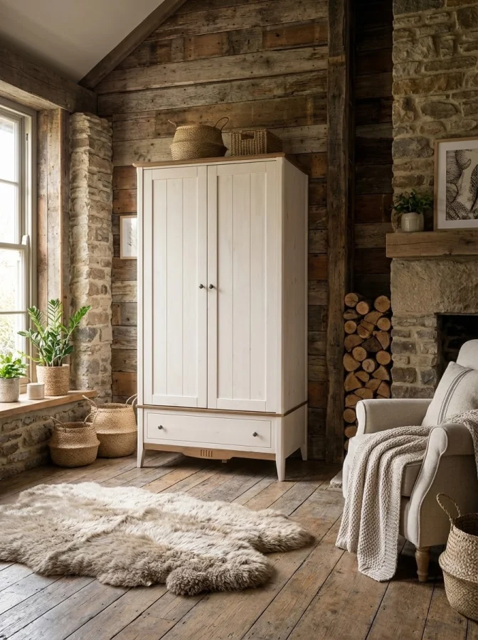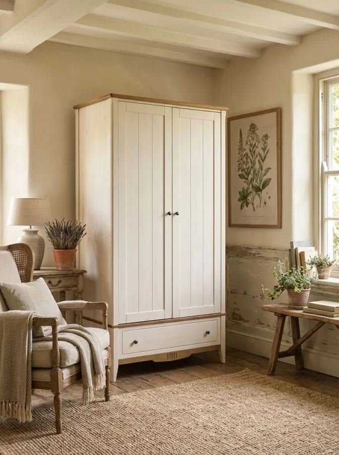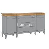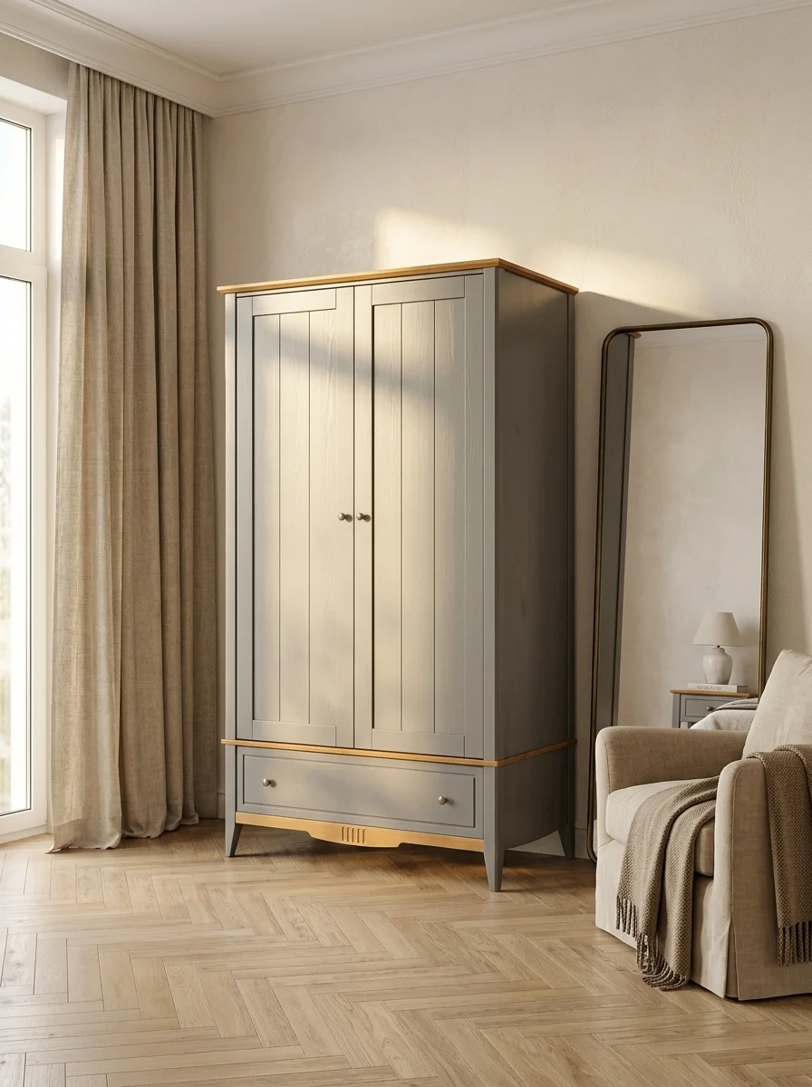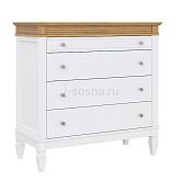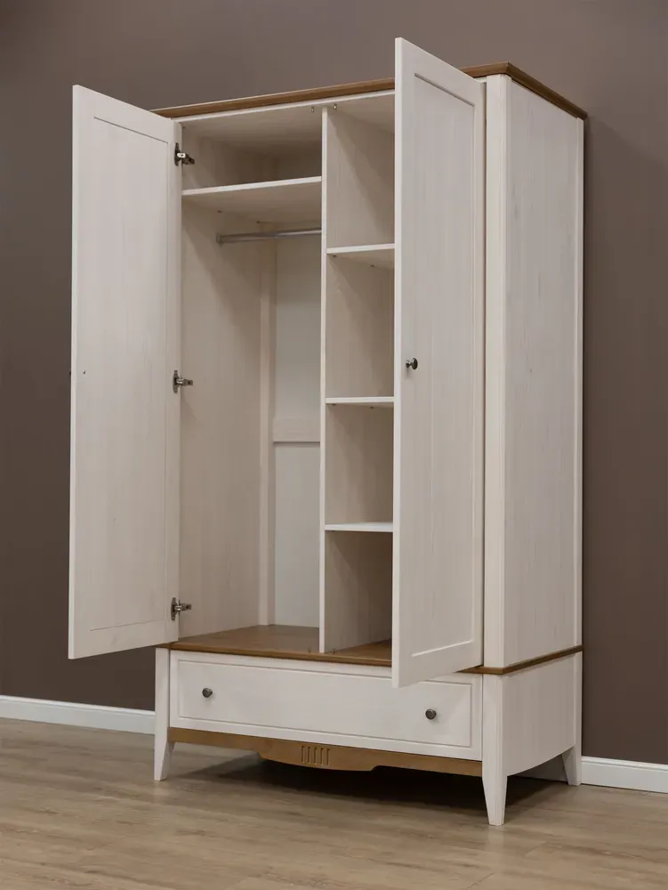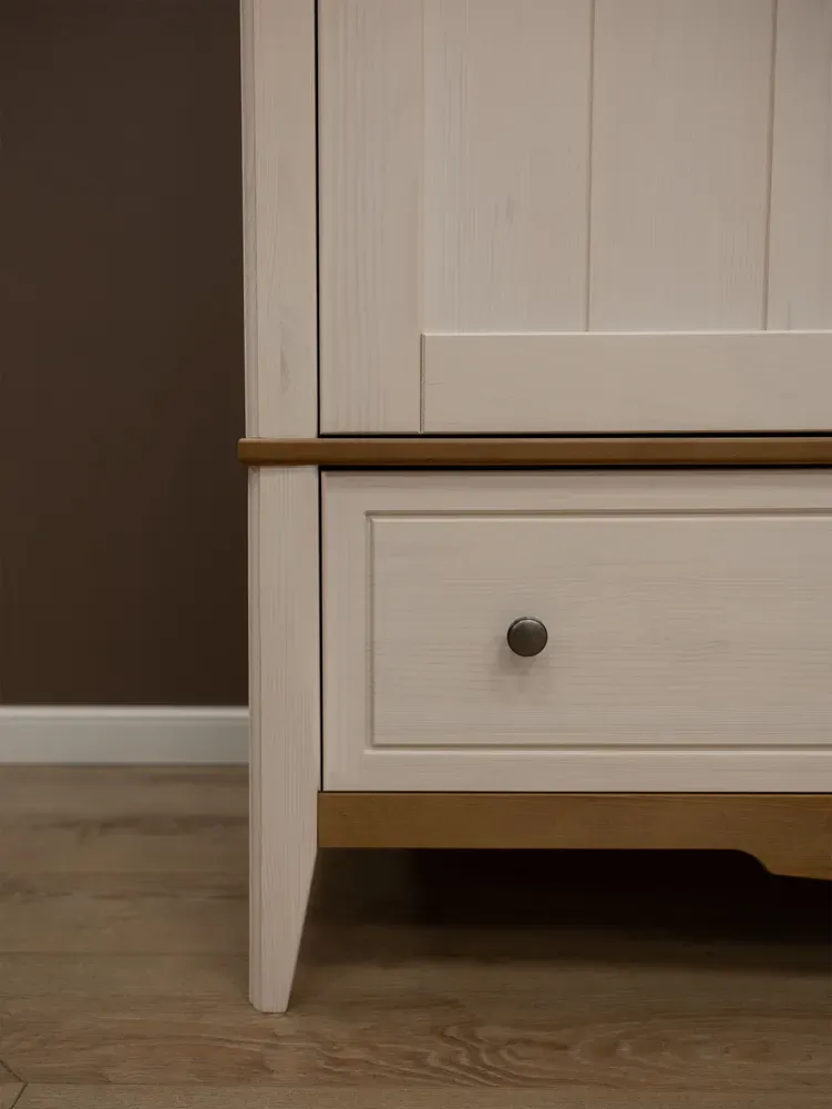 Оригинальным дизайном: корпус шкафа красится в белый, серый и черный цвета по желанию, а карниз, перекрытие между основным отделением и ящиком и нижняя декоративная планка в цвете антик, через покрытие антик видна текстура сосны. Фасады украшены фрезеровкой, в комплекте металлические ручки-кнопки с искусственным старением. Дно ящика изготовлено из ламинированного белого оргалита, стенки ящика сделаны из массива сосны, выкрашены в цвет корпуса.