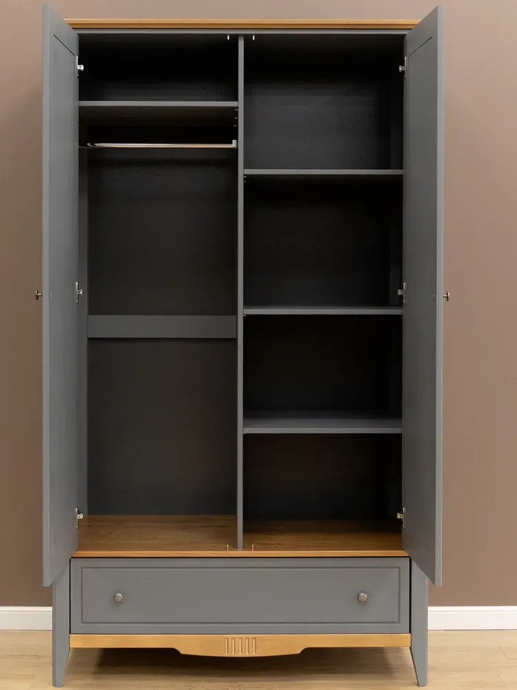 Удобной конструкцией: шкаф двухсекционный, справа три полки с регулировкой по высоте. Слева отделение со штангой для одежды и полкой сверху. Дверные петли с доводчиками Hettich для плавного закрывания. Внизу один широкий ящик на шариковых направляющих частичного выдвижения, без доводчиков. Высота от пола до нижней декоративной планки 12 см, под шкафом пройдет робот-пылесос.