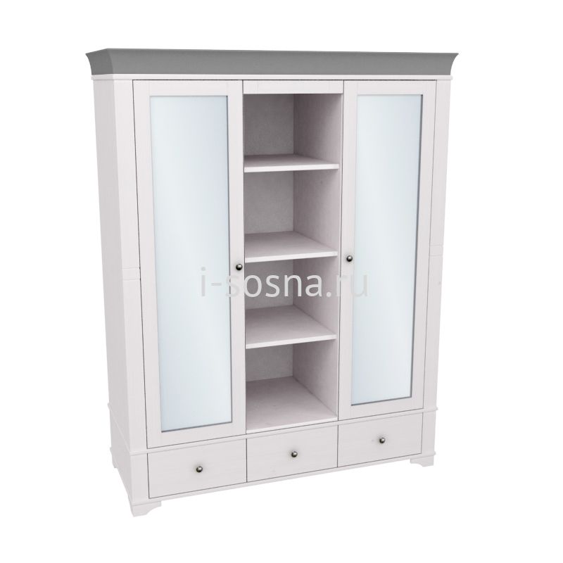 Три выдвижных ящика, левое и правое отделение с полкой и штангой, среднее отделение с полками.Под каждым отделением имеется выдвижной ящик на роликовых направляющих. Дополнительно можно приобрести полки в левое или правое отделение. Дополнительно можно купить ящики для шкафа.