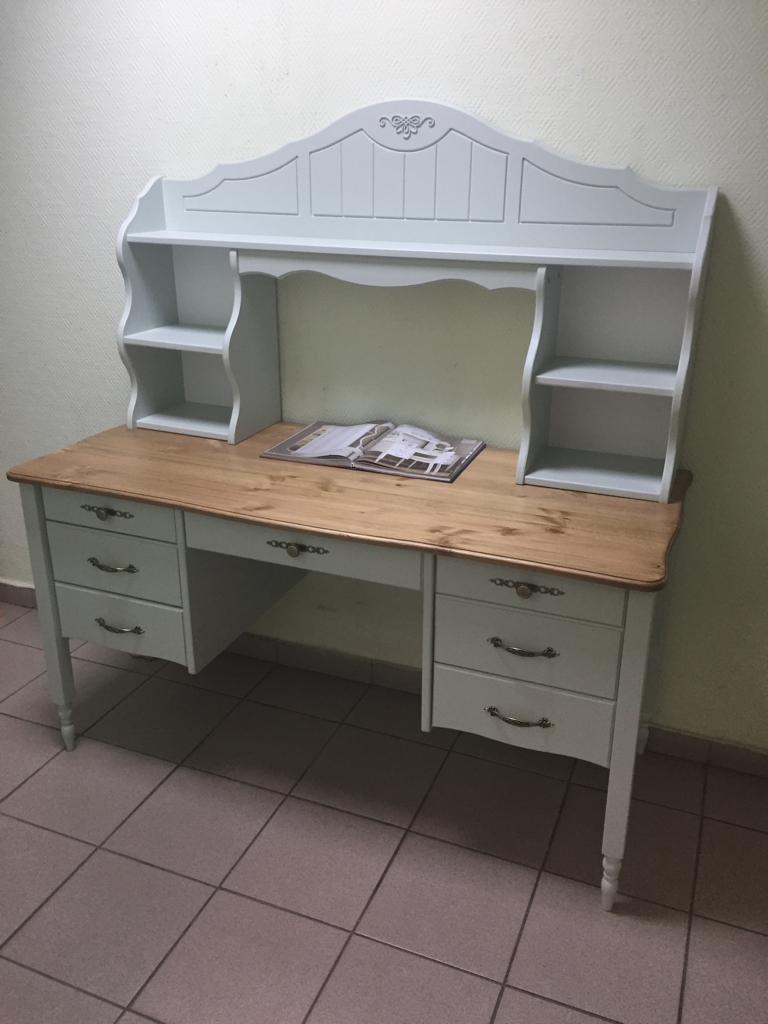 Стол из массива сосны. Покрыт гладкой эмалью. Цвет голубая пастель. Цвет столешницы бейц антик.