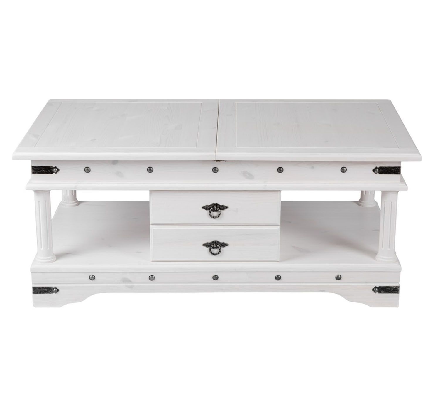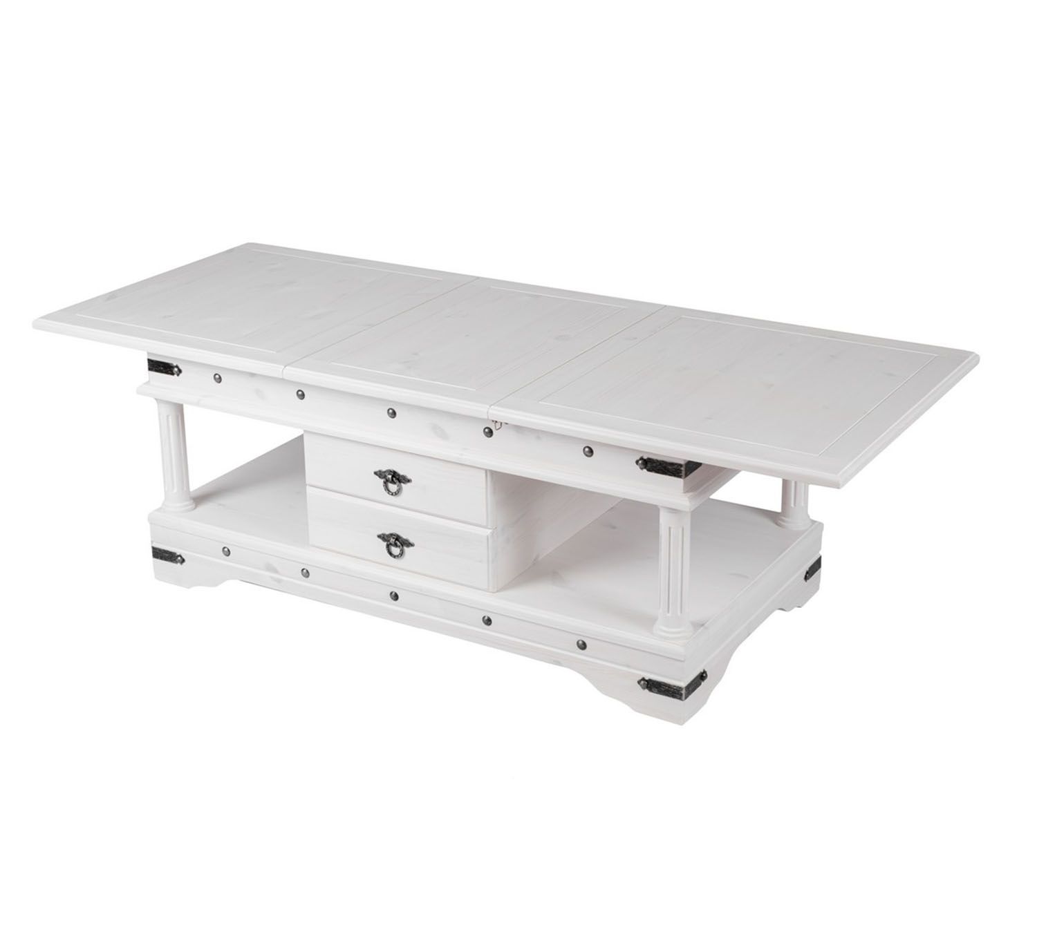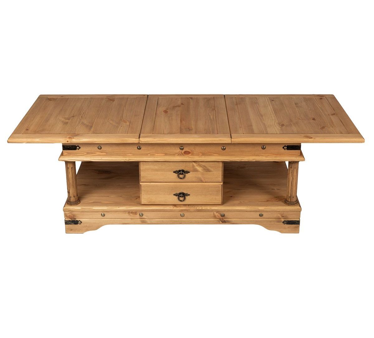 Стол журнальный из массива сосны, искусственно состаренный в стиле Винтаж, отделанный металлическими элементами ручной ковки. Раздвижная столешница с баром внутри.