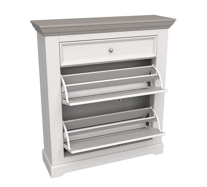 Тумба для обуви Форест. Имеет две откидных дверки и выдвижной ящик. За каждой дверкой расположены отделения для хранения обуви веерного типа.