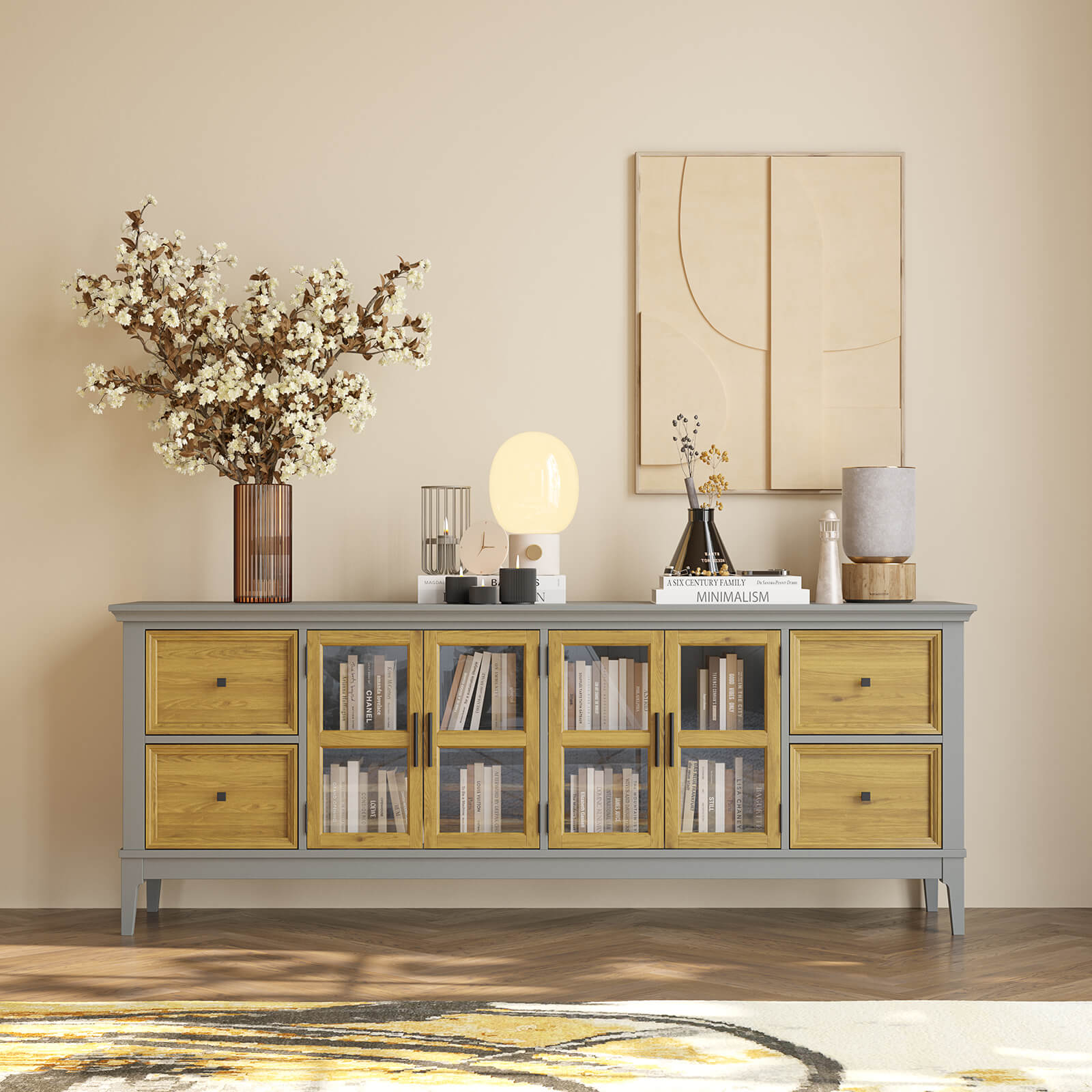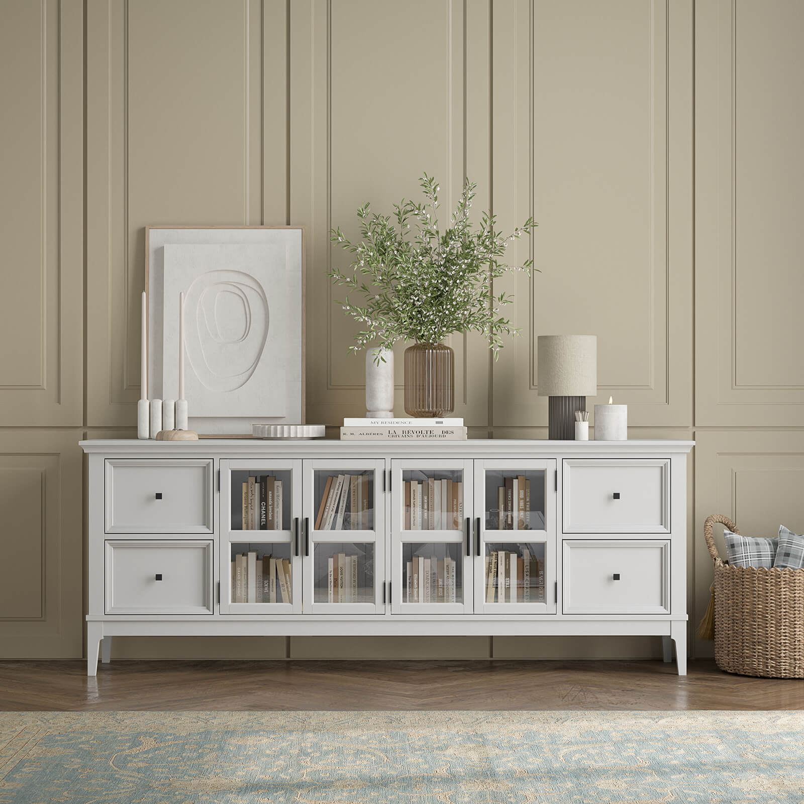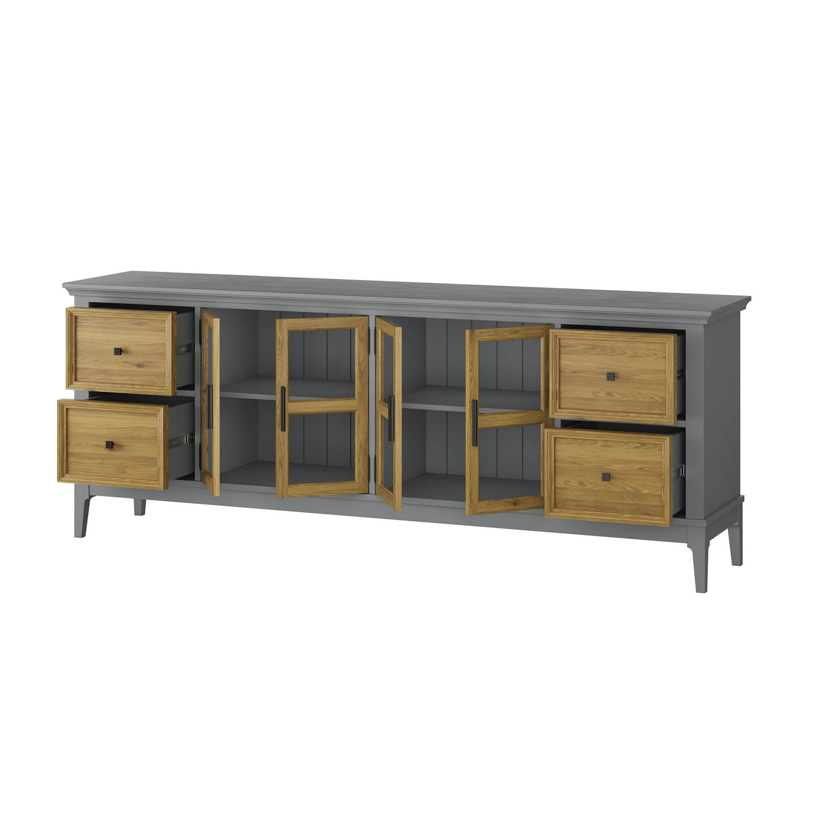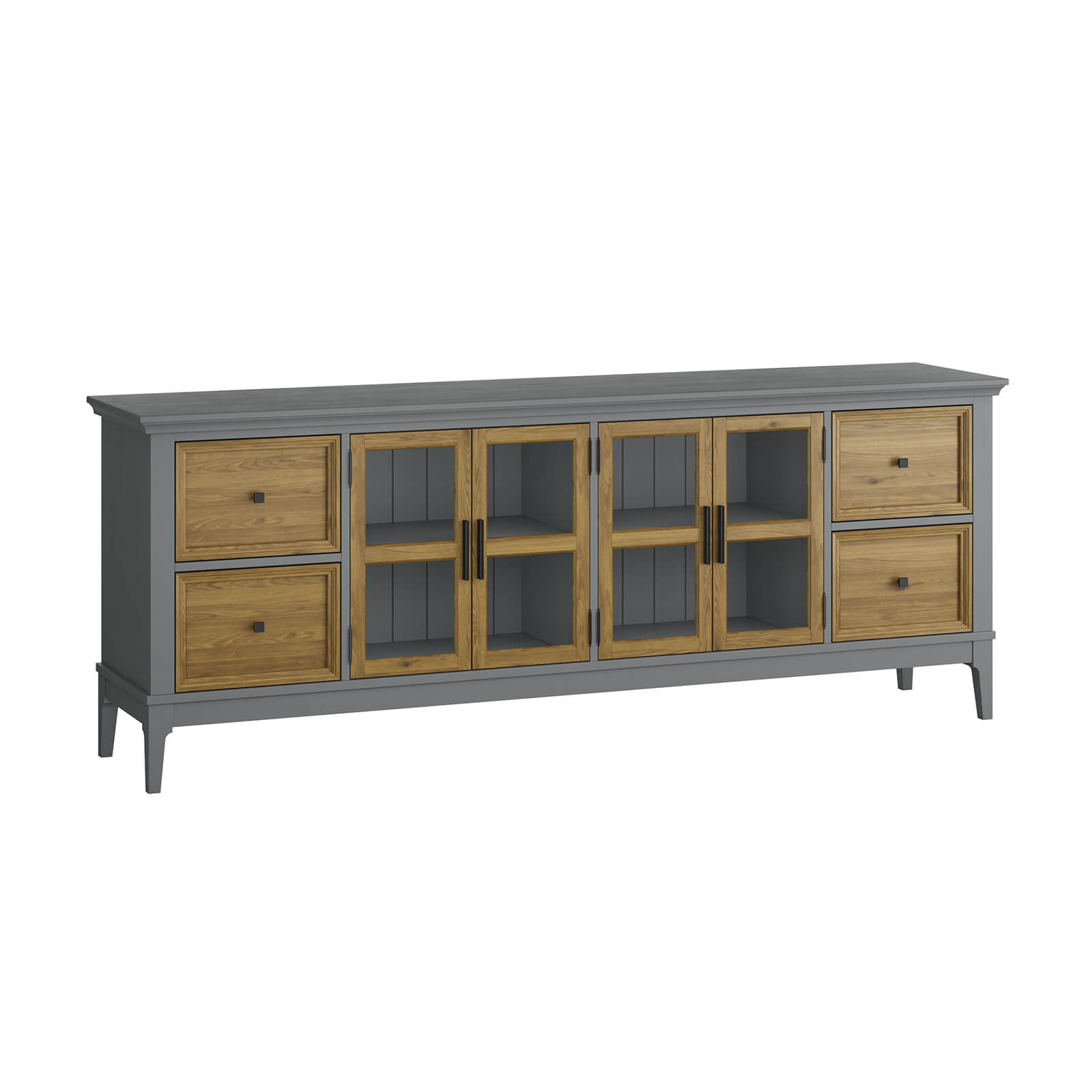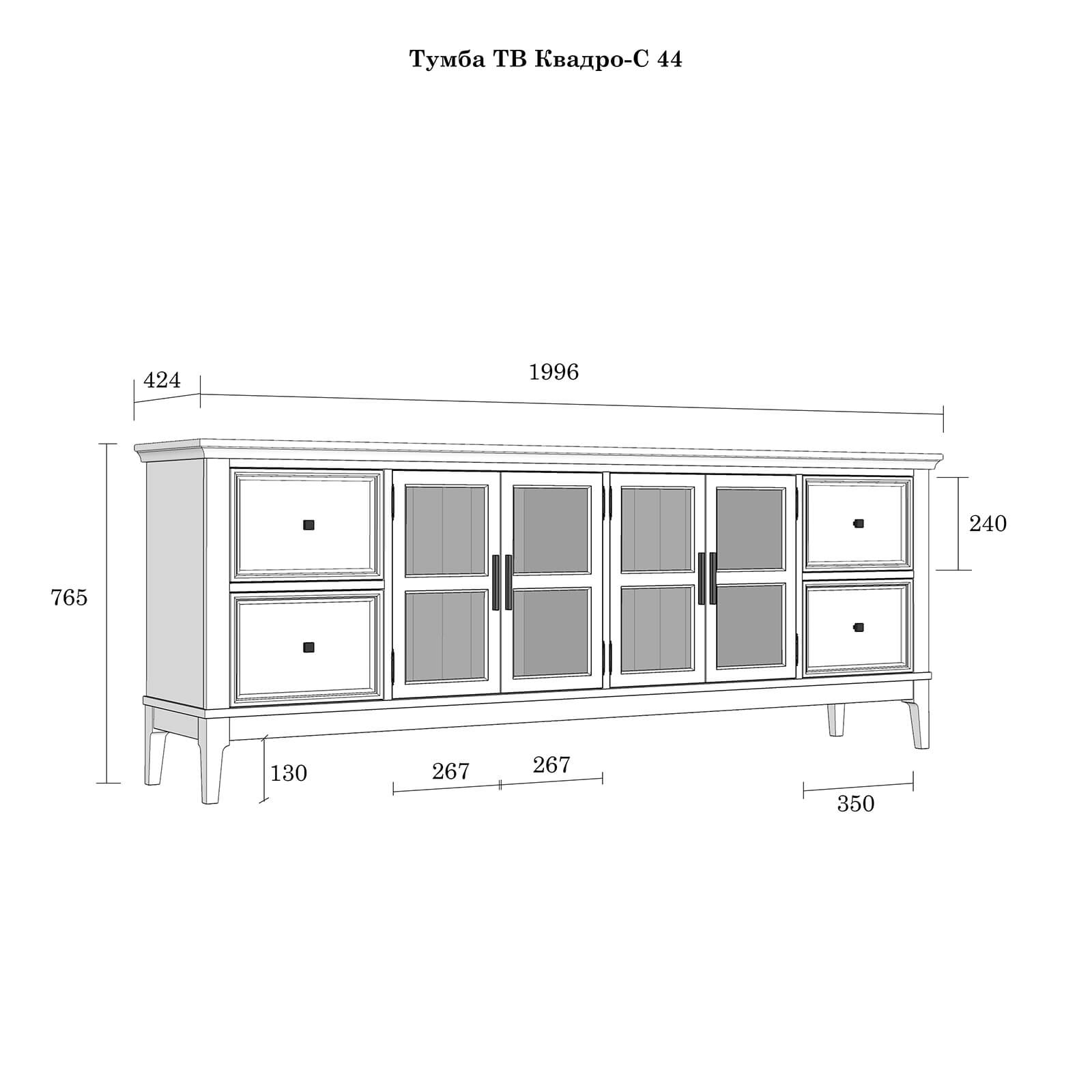 Предлагаем Вам привлекательную тумбу для ТВ «Квадро-С» 42 из массива сосны для гостиной или спальни. Тумба ТВ состоит из двух отсеков за четырьмя стеклянными дверками и четырьмя выдвижными ящиками по бокам. Внутри две широкие полки.