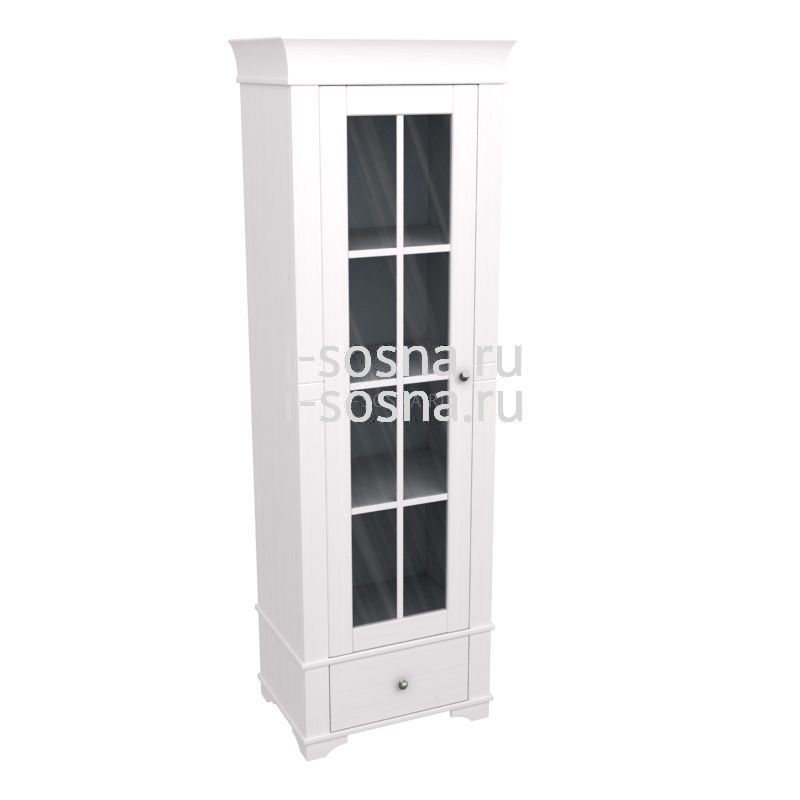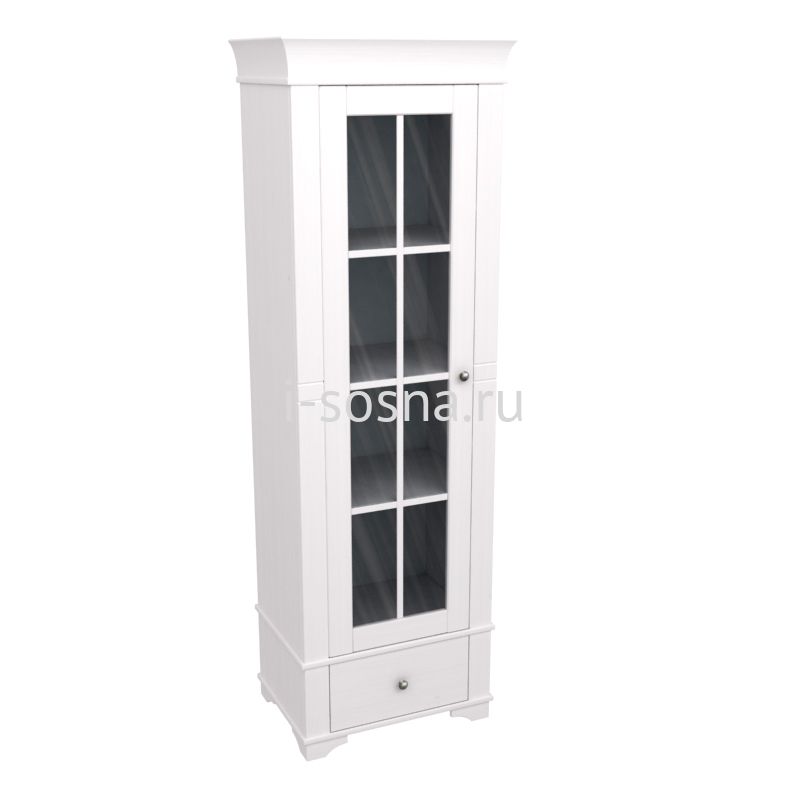 Витрина со стеклянной дверью. Один выдвижной ящик в нижней части и три полки за дверью.
